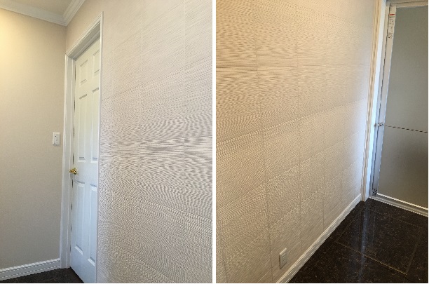 鏡面扉、大理石調のカウンター、床の光沢ある石目のブラウンと淡いベージュのエコカラットの組み合わせが大人っぽく、高級感のある空間になりました。ドア枠、巾木、廻縁には存在感のある装飾モールを取付けて、モダンな中にデコラティブが融合したまさに高級ホテルの雰囲気です。