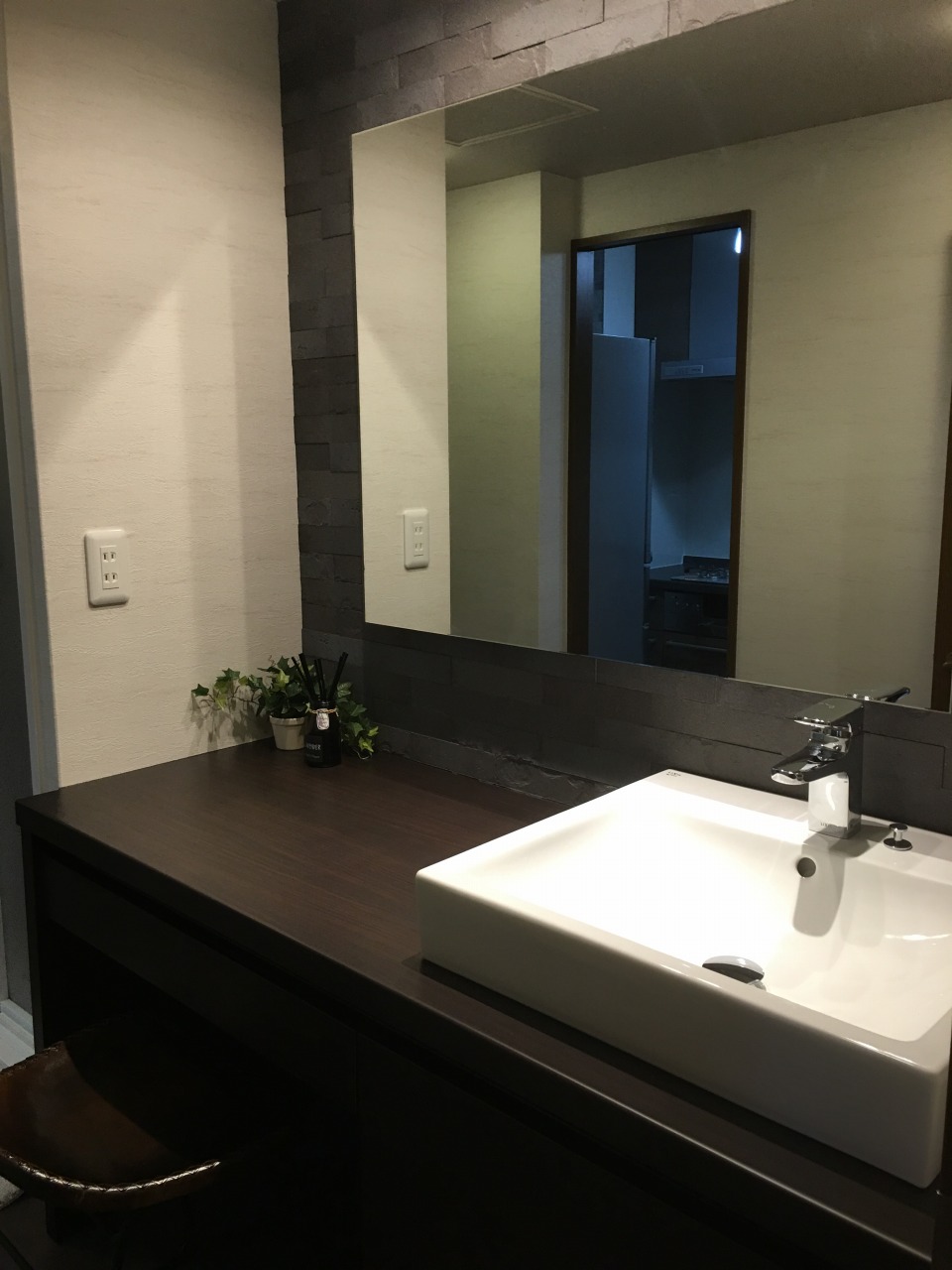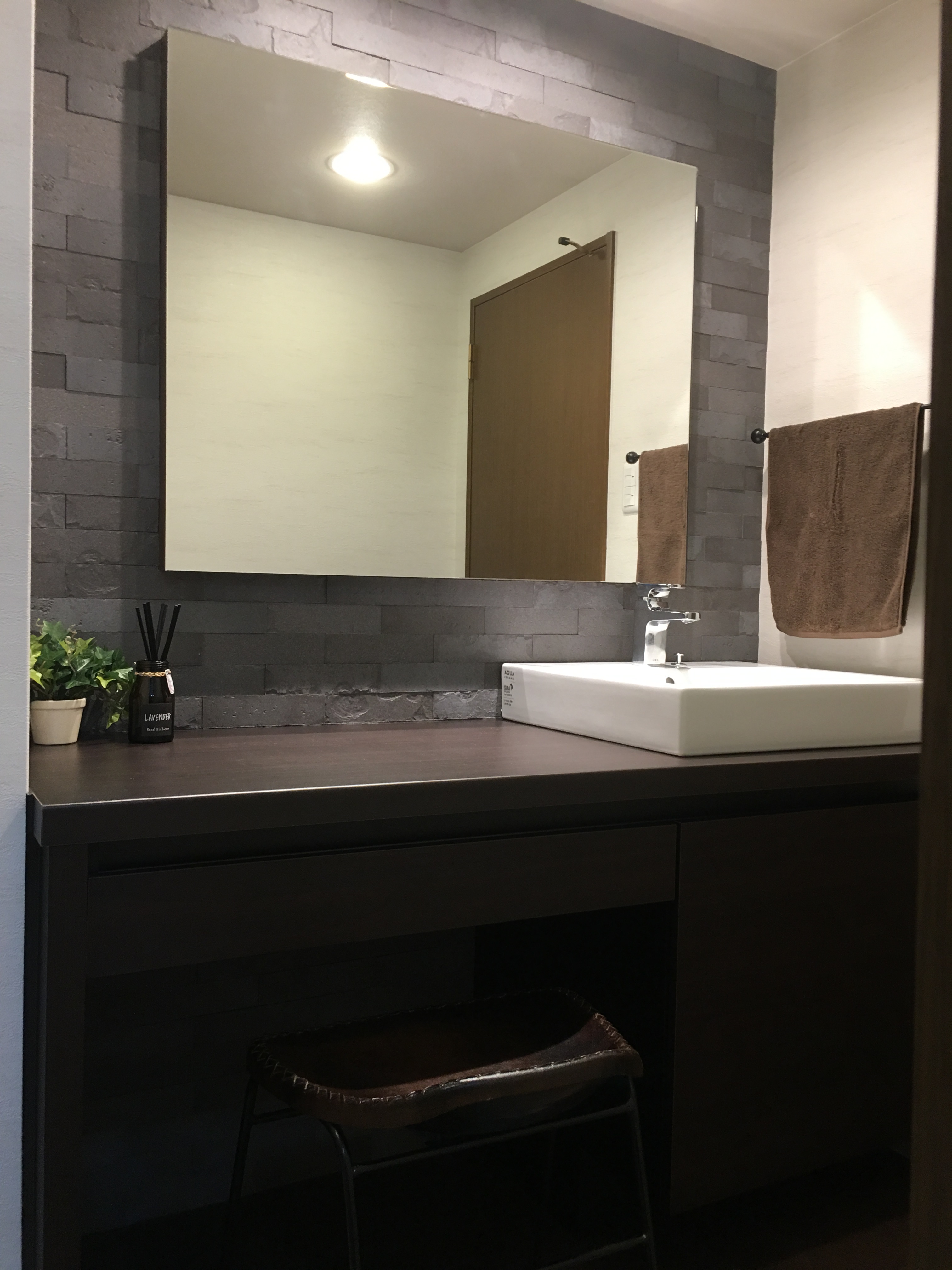 インテリアの情報集めが大好きな奥様。雑誌やPCサイトで気に入った写真を集めてご自宅のイメージを膨らませていらっしゃいました。ご夫婦二人になられたのを機に、夢をカタチにする為リフォームのご依頼をいただきました。洗面スペースは、既存のオープン棚を撤去して、W1450の化粧台を壁から壁に設置しました。木製カウンターに洗面ボウルを乗せたタイプで、ドレッサーや家事スペースとしてお使いいただけます。奥壁にはエコカラットでアクセントと湿気対策を。ミラーは一面鏡を壁から持ち出して、オシャレさUP。万が一の破損時にも取替が楽です。奥様のセレクトに少しアドバイスをさせて頂き、仕上がりにとてもご満足いただけました。お気に入りの小物を置かれて大好きな空間作りを楽しんでいらっしゃいます。