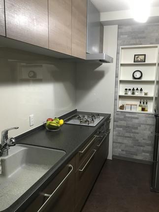 キッチンにはトクラスのベリーを採用。生活感が出ない、モデルルームのような仕上がりをご希望でシックな色合いをセレクトされました。アッパークラスのキッチン、ベリーは存在感があり高級感が漂います。悩まれていたフロアーは扉の色に合わせてご提案させて頂きました。とても良く合って、喜んで頂きホッとしました。クロスは、「どうかなあ」と迷われていましたが、「狭い空間ですし、お好きな柄を思い切って貼られてみては?」とお勧めしました。結果は・・・いい感じ!
