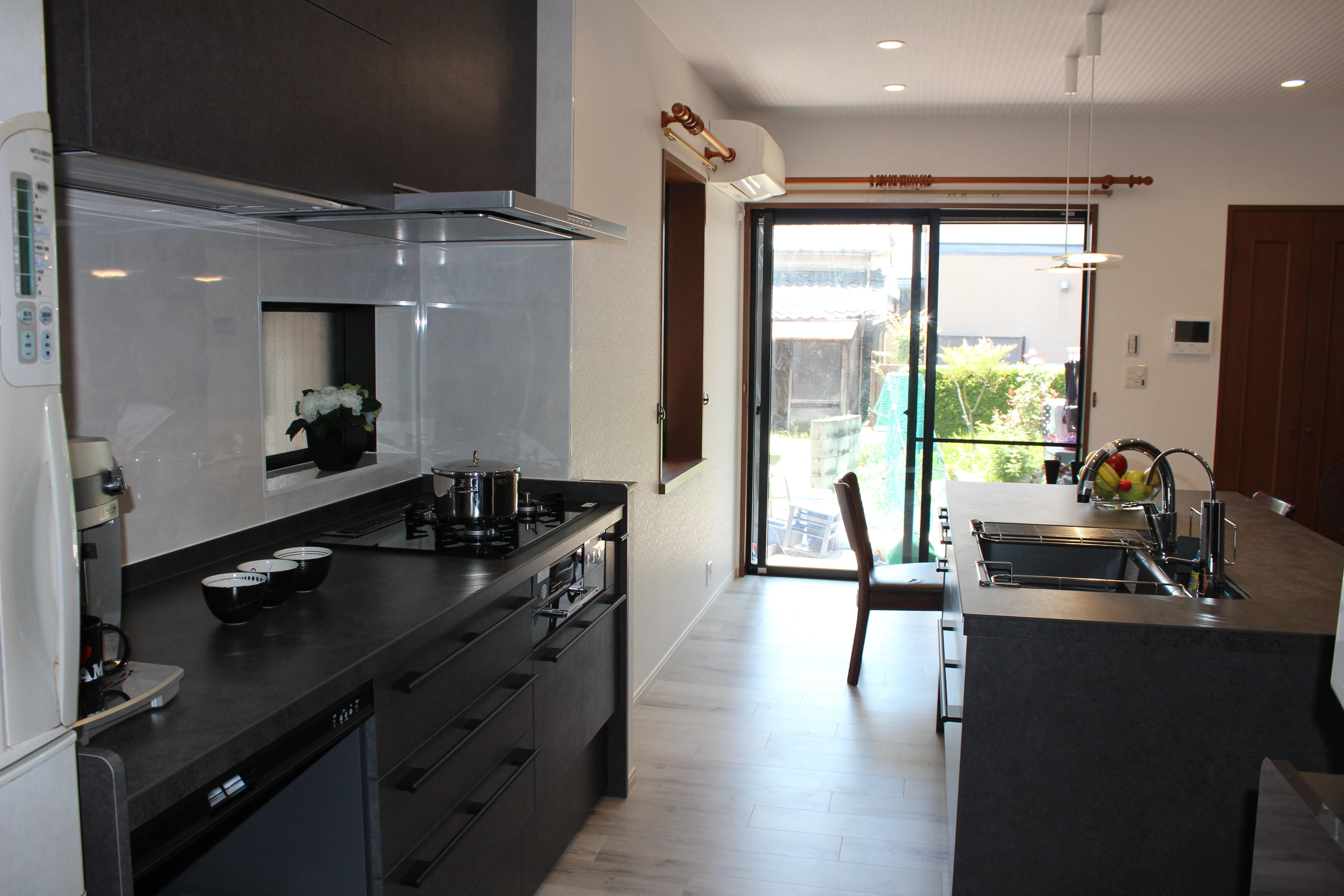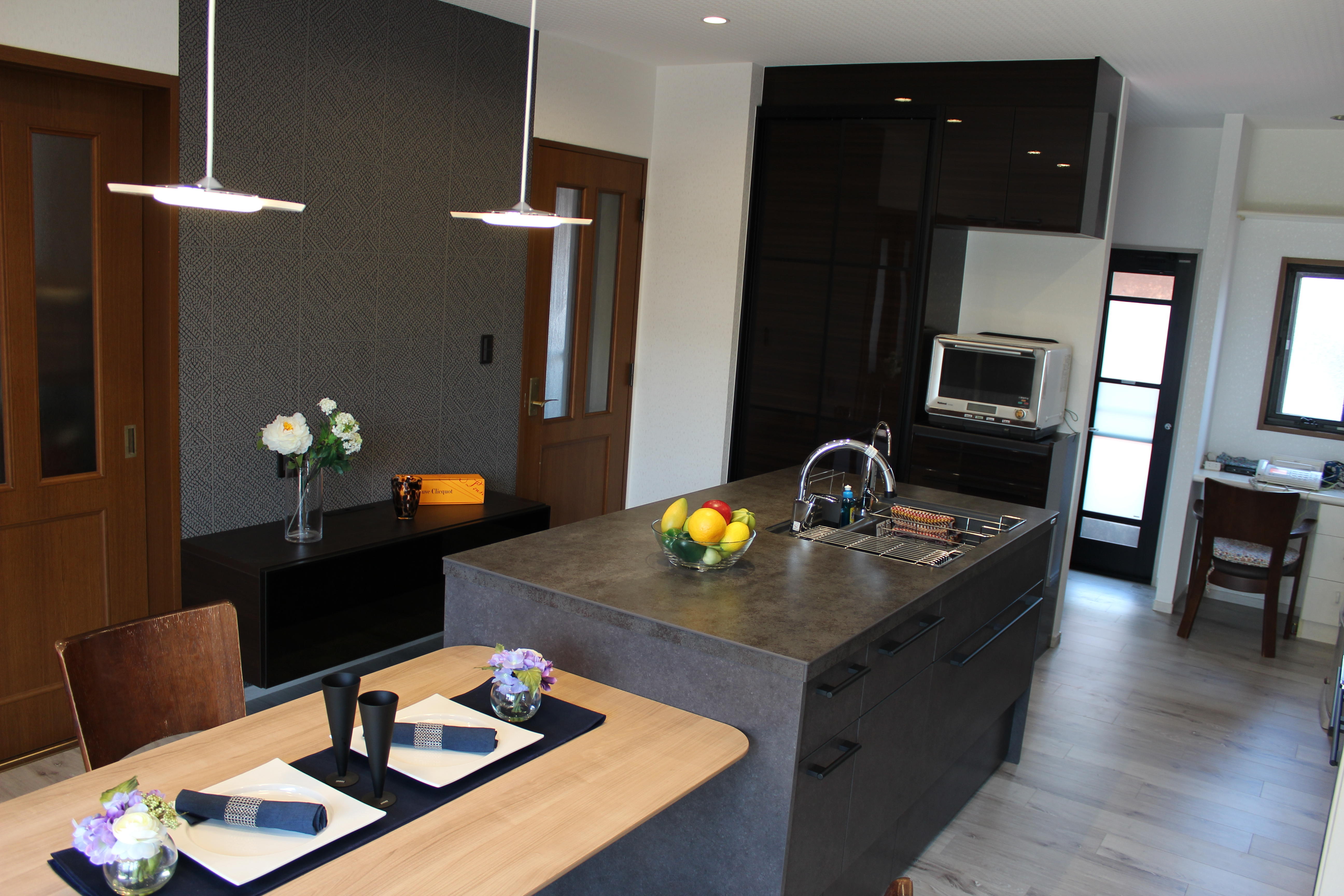 お子様が大きくなられて住まい方が変化し、ステイタス性を重視し、会話を楽しみおもてなしをするキッチンにシフトされたいというご要望でした。I型キッチンをお部屋の中心に配置するには奥行きが足らなかった為、2列配置のアイランドタイプでご提案しました。主役となるキッチンは、ショールーム行かれて一目惚れされたLIXIL リシェルSIです。ショールームの雰囲気をそのままに、インテリアにもこだわられた大人格好いいダイニングキッチンになりました。