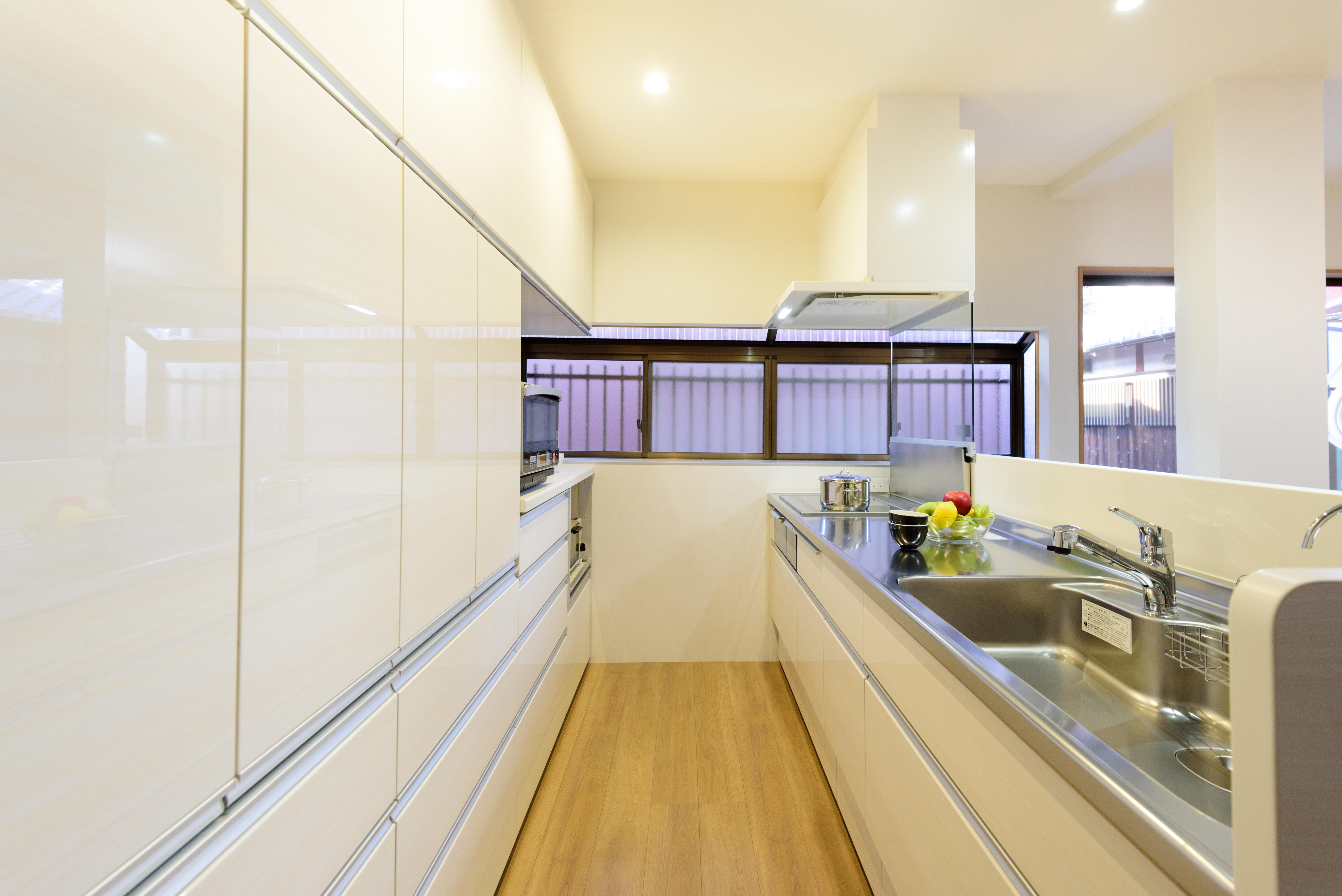 清潔感のあるホワイト鏡面ベースのキッチン。さりげない木目がぬくもりをプラスしています。キッチン出窓からの採光も取り込みたいので、キッチンはオープンタイプのリシェルSIに。ただし、手元が見えたくないというご要望で、フラットタイプではなく、対面ユニットを採用しました。ダイニング側から見ると家具のように見えてとてもオシャレです。程よい立ち上がりが、調理中の手元を隠してくれて助かります。片付けが苦手とおっしゃるお嫁さんの為に、収納部は見えない収納に。容量もたっぷりで、今まで使用していた食器棚の物が全て納まりました。