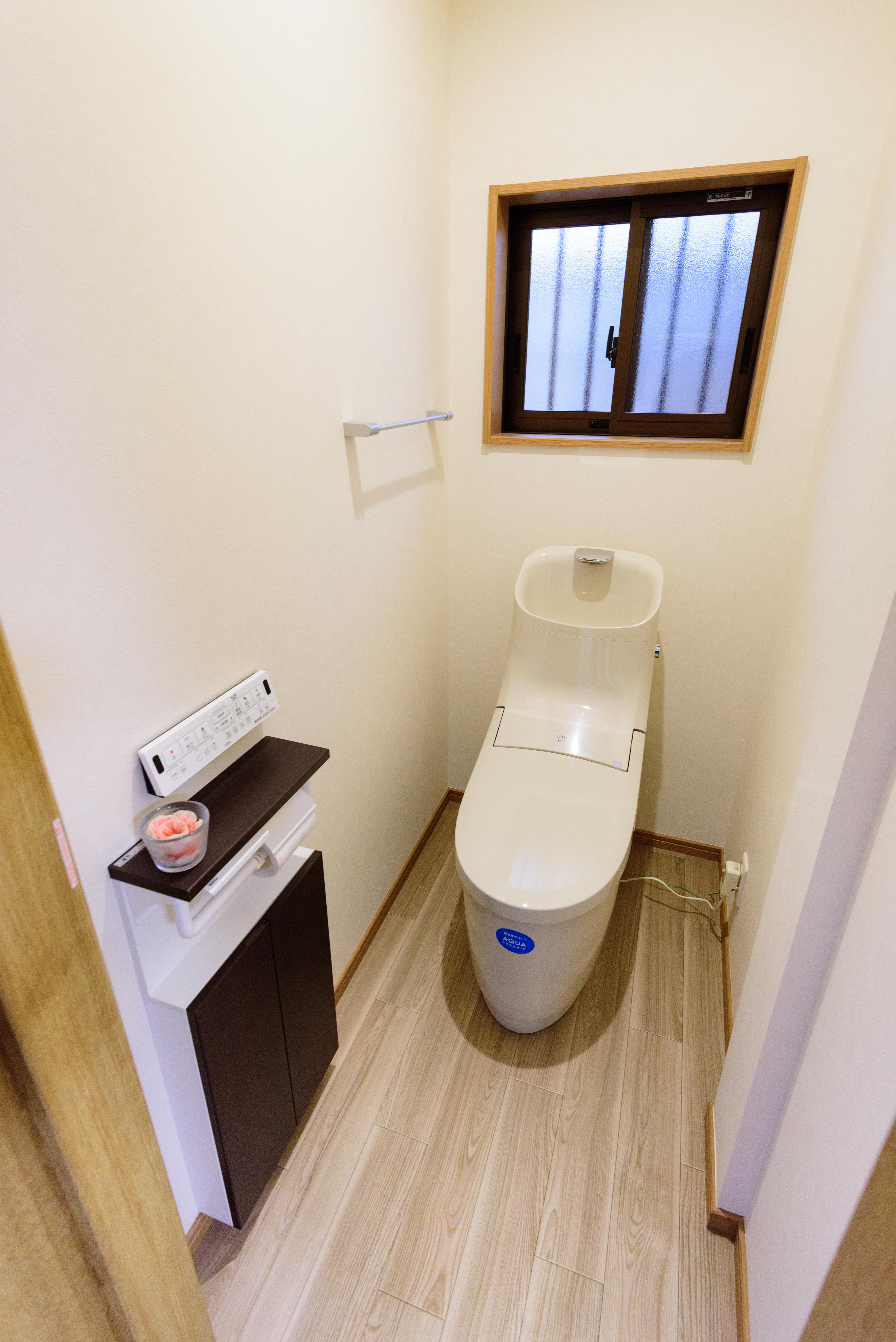 コンクリート造のタイル貼りだった以前のトイレは、寒くて、段差もあり、つまづきやヒートショックなど、夜中のトイレに不安を感じておられました。元々場所は撤去し、トイレはダイニングから直接入ることができる場所に移動しました。おじいちゃんの部屋からはバリアフリーで行け、外壁側には断熱材を入れて暖かくなりました。トイレットペーパーなどをしまえるよう、半埋め込みタイプの収納棚も設置しています。
