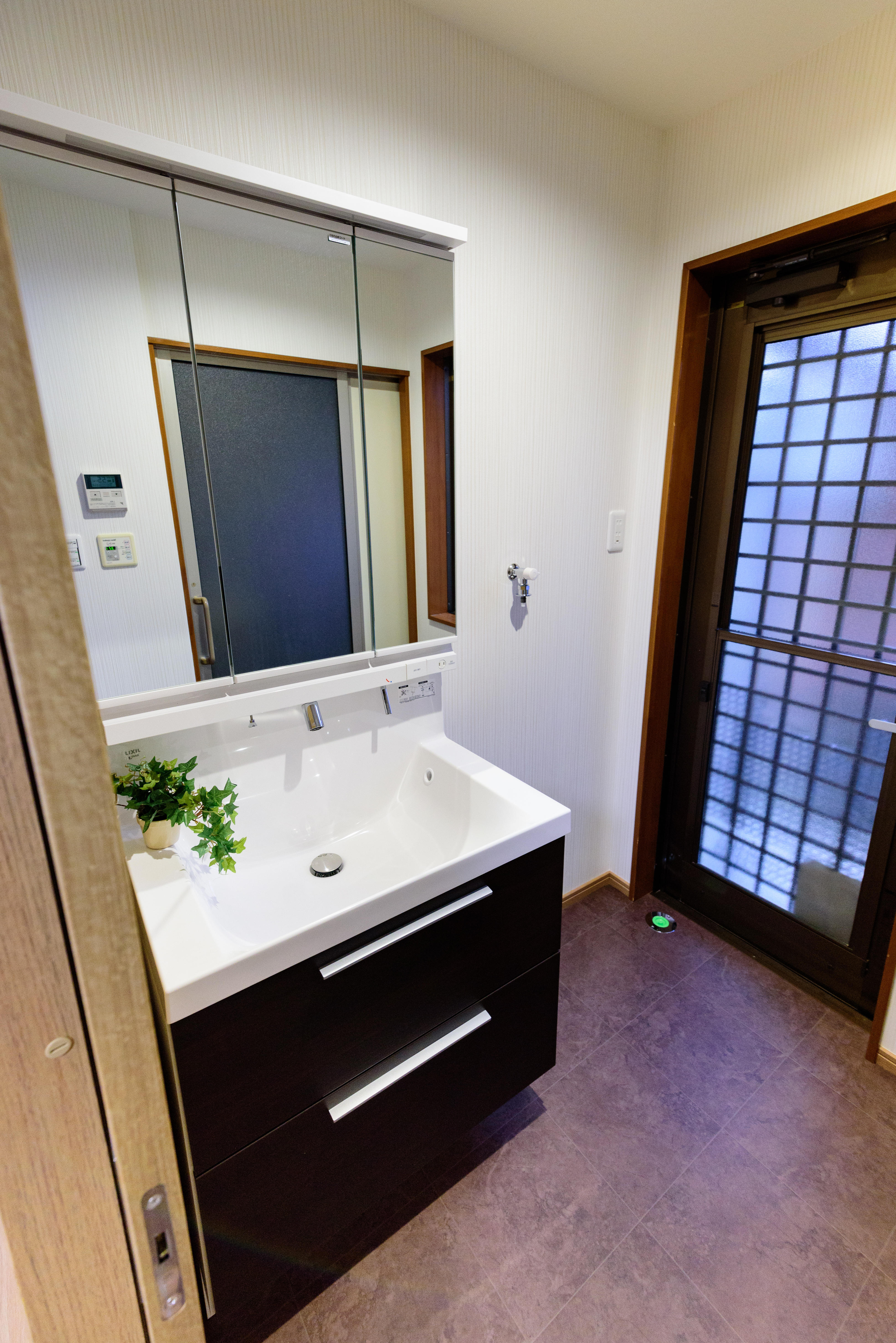 タイル張りで寒々しく、以前の裏廊下からの出入り口用のガラスはめ込みの親子ドアをそのまま使用していたので、着替えの時のシルエットが映ってしまっていた洗面室。裏玄関を兼ねているので、入浴中は出入りができない不便さがあり、入っている側も落ち着かなくて不自由さを感じておられました。まず裏玄関の位置を庭寄りに移動させ、動線を整理しました。洗面台の隣には洗濯機を設置するので、既存の勝手口は出入りできなくなりますが、撤去すると余計な費用がかかるので、そのままにして、通風用してお使いいただくご提案をしました。収納力と使い易さ、清掃性にこだわって選ばれた洗面化粧台はL.C(LIXIL)。オールスライドで収納しやすく、三面鏡裏も全て収納になっています。シルエットが気になっていたドアは、引戸に変更しました。