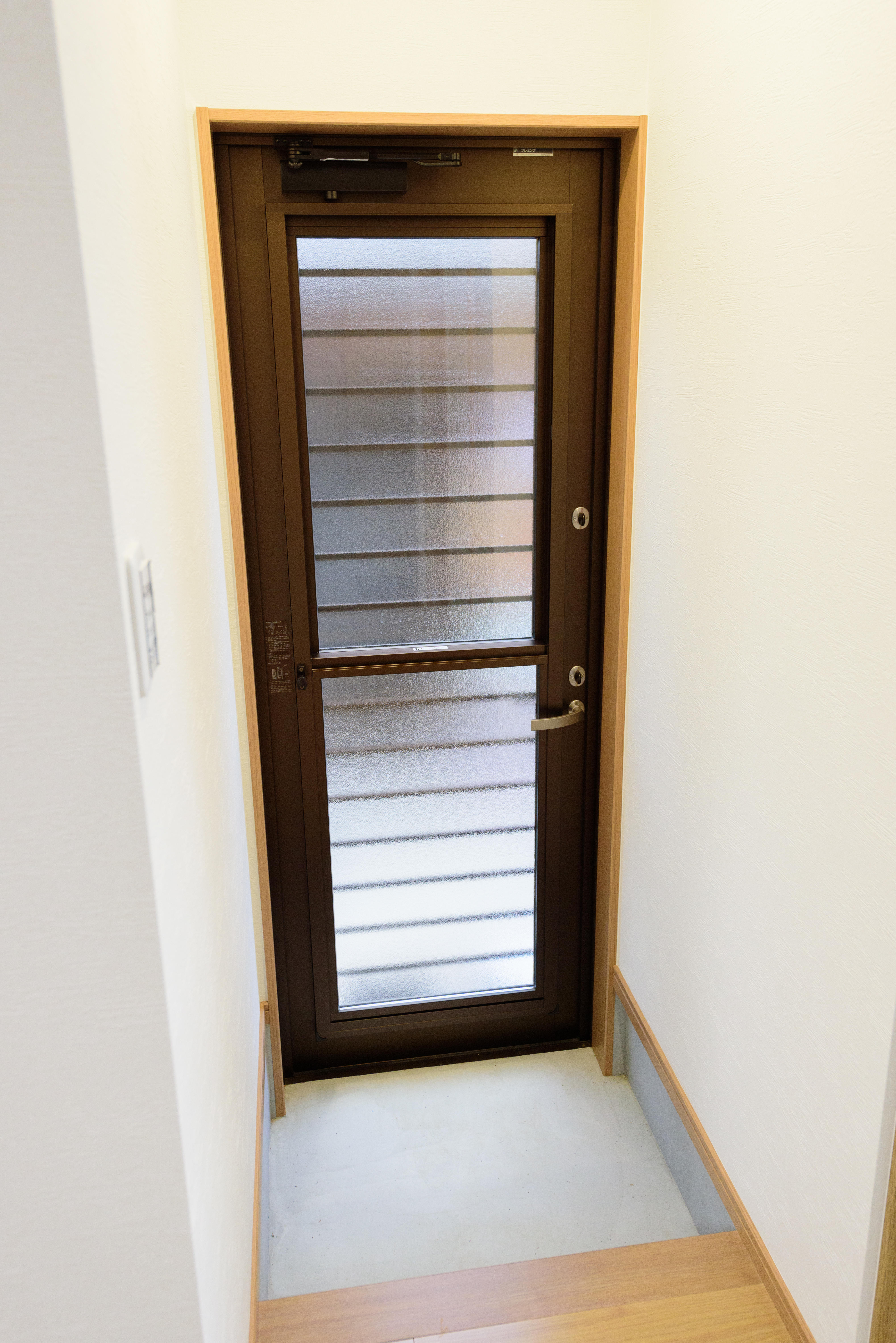 洗面室から出入りしていた裏玄関は、移設しました。以前は、ドアを開けたらすぐにキツイ段差があり、危なかったので内側に三和土部分も作りました。センサーライトで夜遅く帰られる息子さんも安心です。