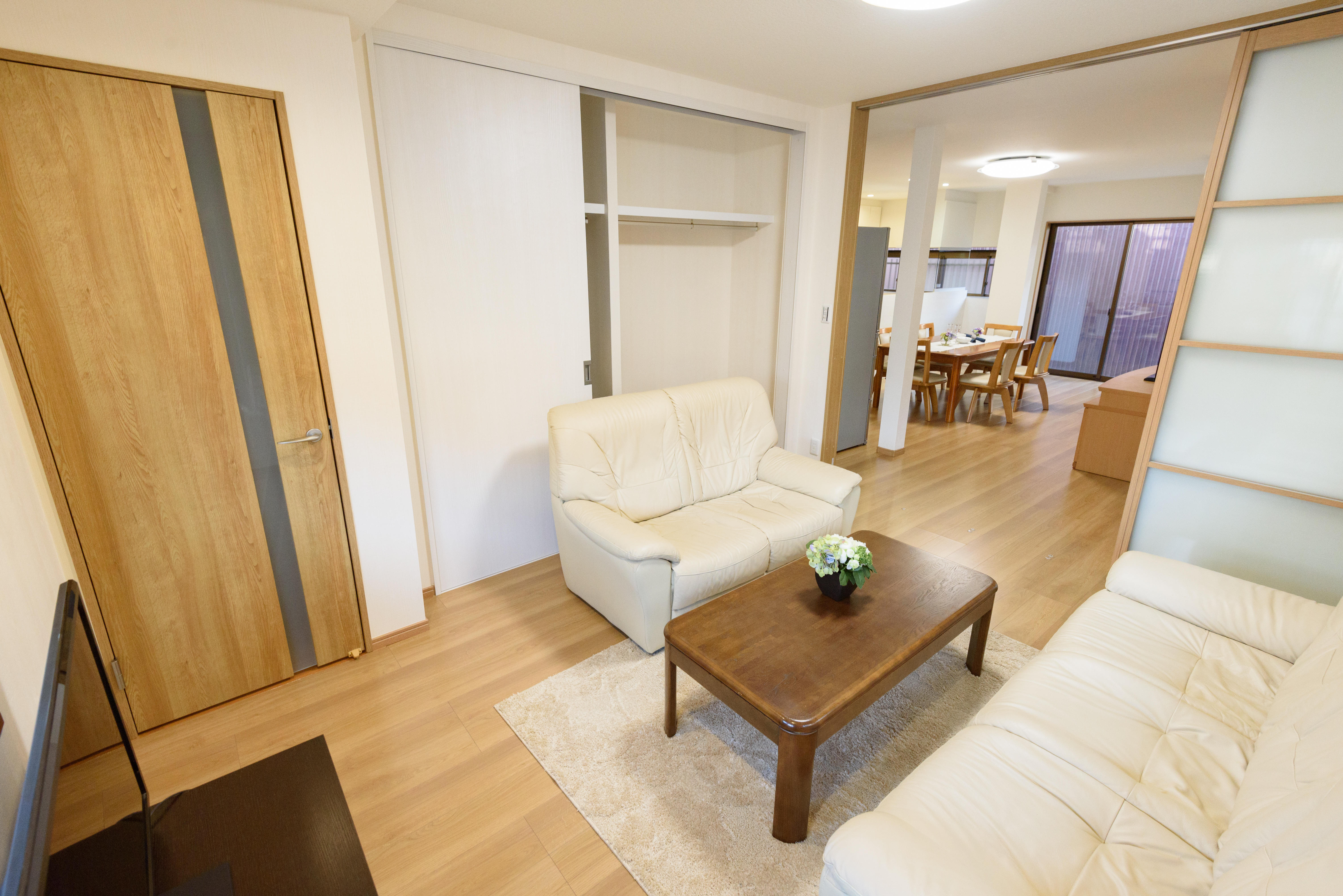 タンス置場にしていた10帖の応接室の一部を裏玄関として使用しました。また大型クローゼットを新設してスペースは小さくなりましたが、収納場所が増えて、置き家具やいままで置きっぱなしにしていたものが全て片付き、空間が有効に使えるようになりました。ダイニングとの間仕切りには、天井までの高さのスライドドアを採用しました。開けておくと、応接室からの光がダイニングに届きます。来客時は閉めて使用でき、その際も、乳白色ガラスから光が漏れて圧迫感がありません。