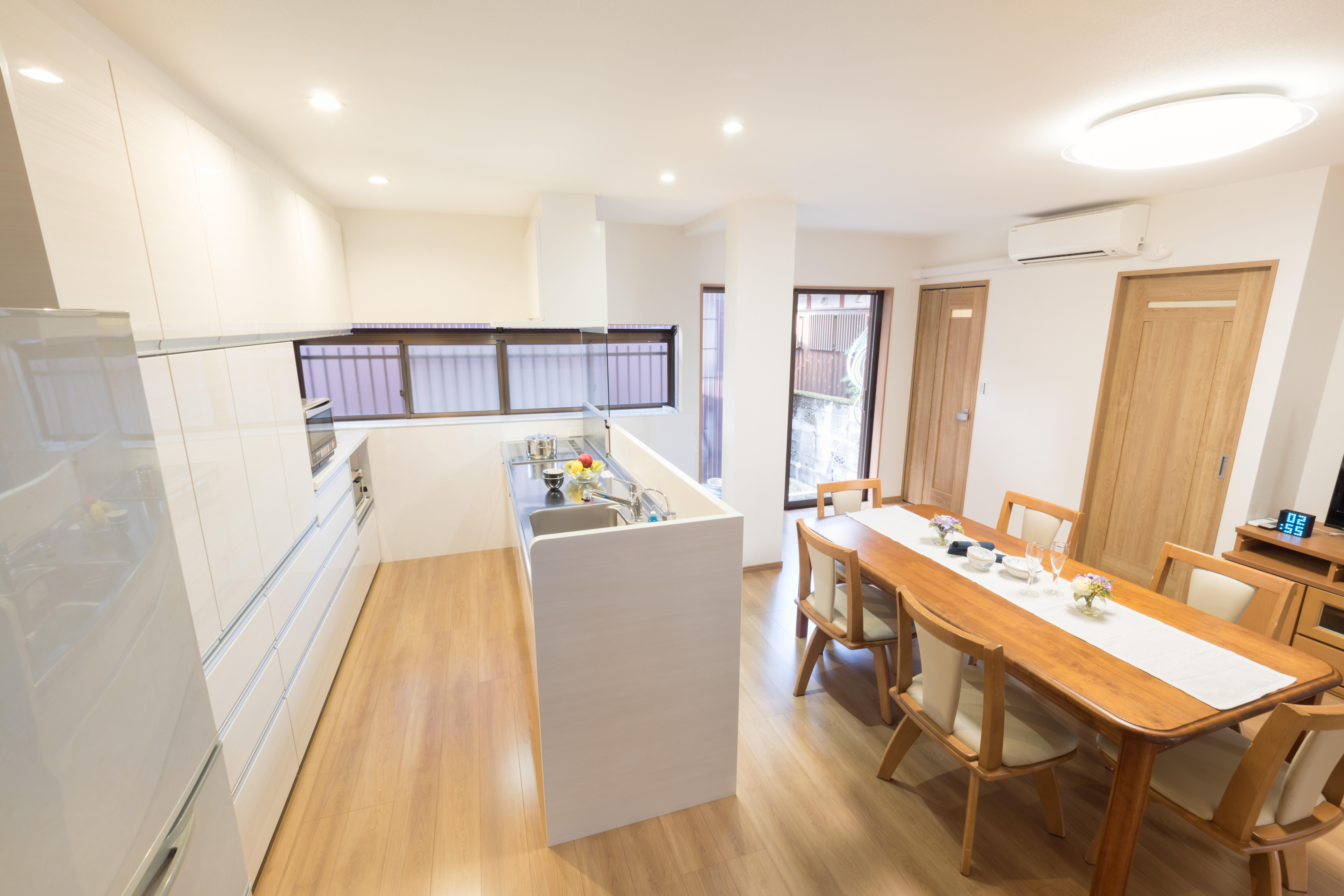 キッチン出窓の光が取り込めるよう、オープンの対面キッチン。大型収納で見た目もスッキリ。