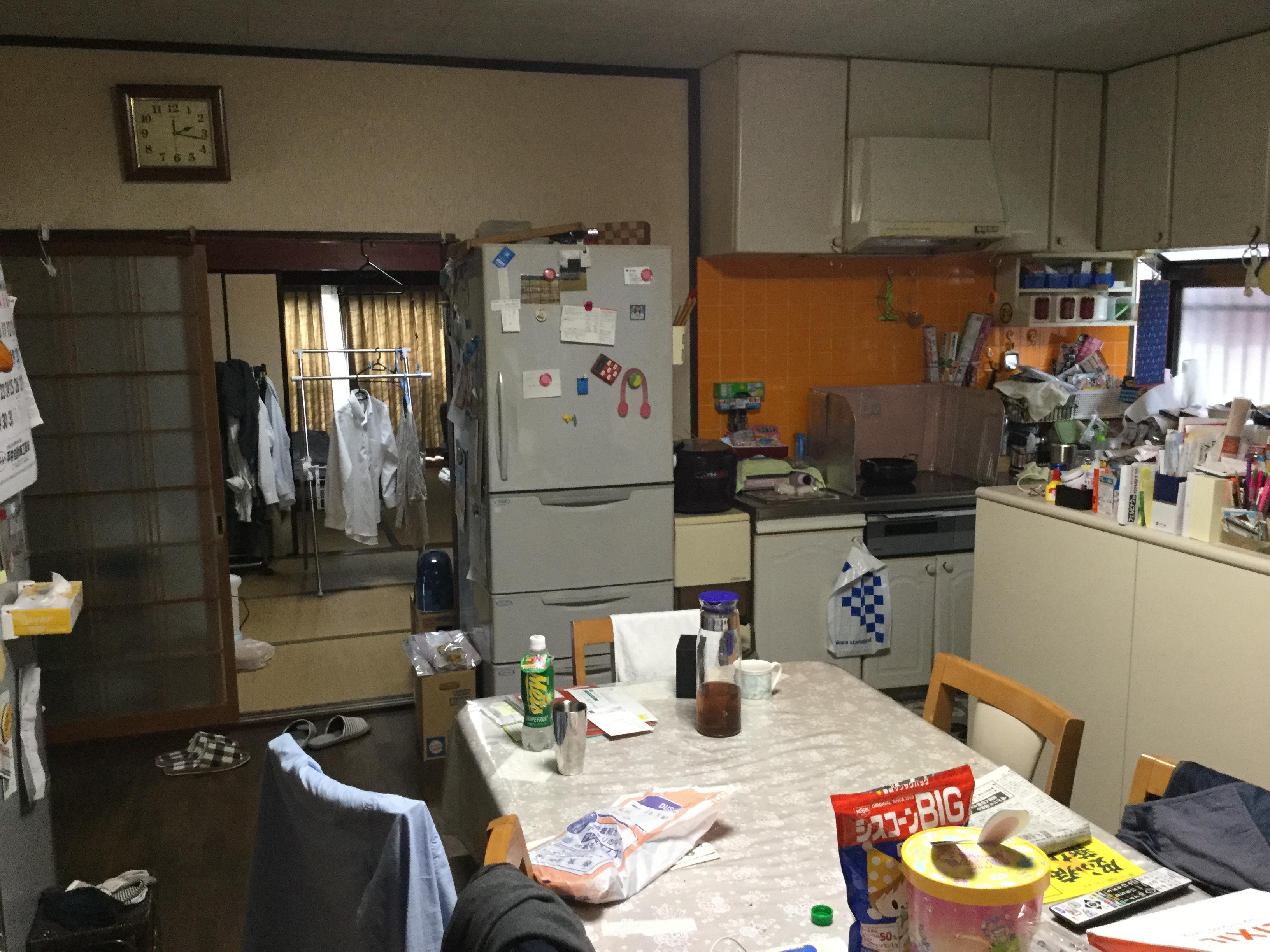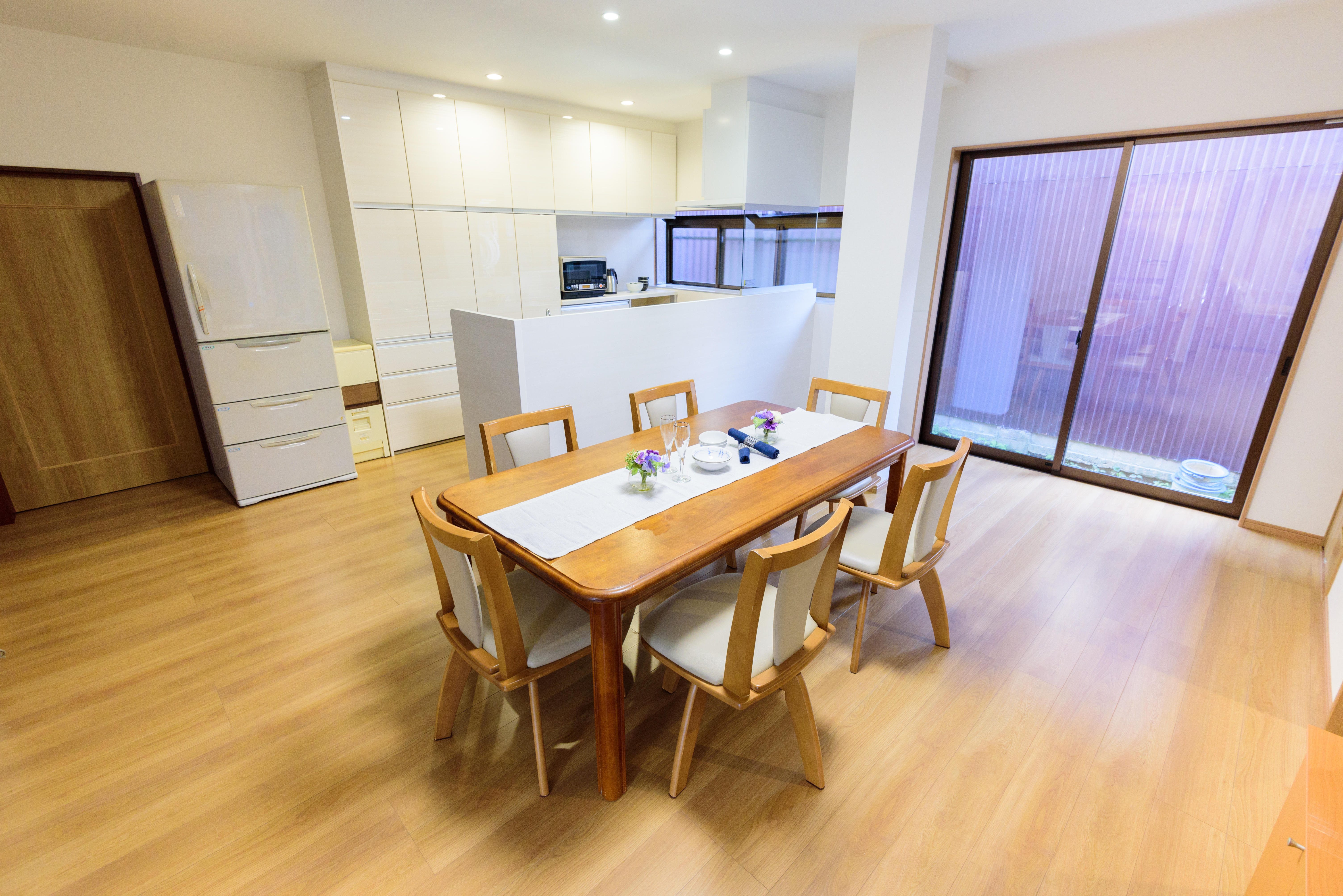 お風呂を移設して、トイレと物置だけになっていた水廻りスペースを解体して大きな掃出し窓を新設しました。2階のトイレの配管を隠すための垂れ壁は撤去して、配管を通し柱の際に移設して柱と一緒に囲ってクロスで仕上げました。圧迫感のあった垂れ壁が無くなってスッキリです。傾いていた床を調整し、床は明るいオーク色に貼り替えました。光と風が入る心地良いダイニングルームに生まれ変わりました。