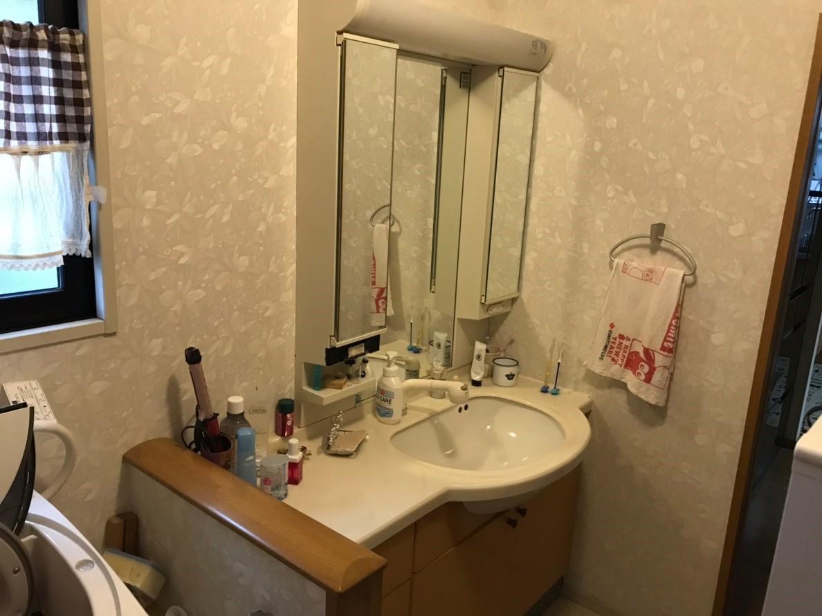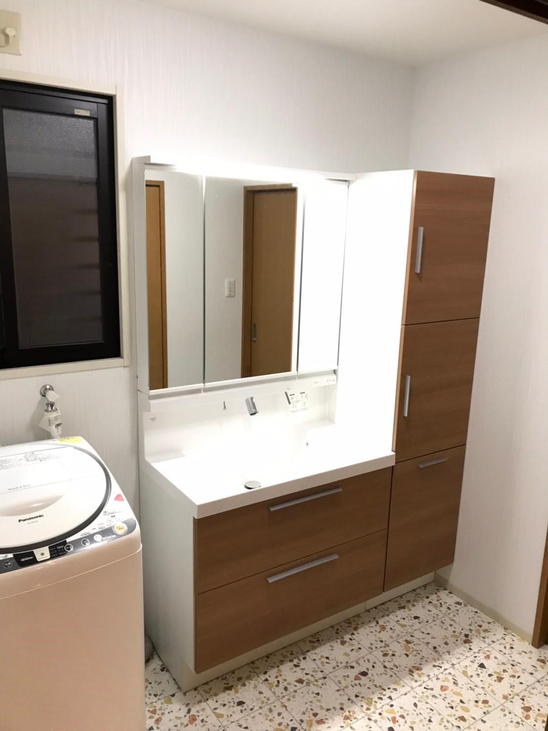 なかなか日用品を収納しきれなかった洗面化粧台。三面鏡全収納に加えて横にトールキャビネットを配置することで収納力がすごく上がりました。採用された洗面化粧台はLIXILの「L.C.」です。
