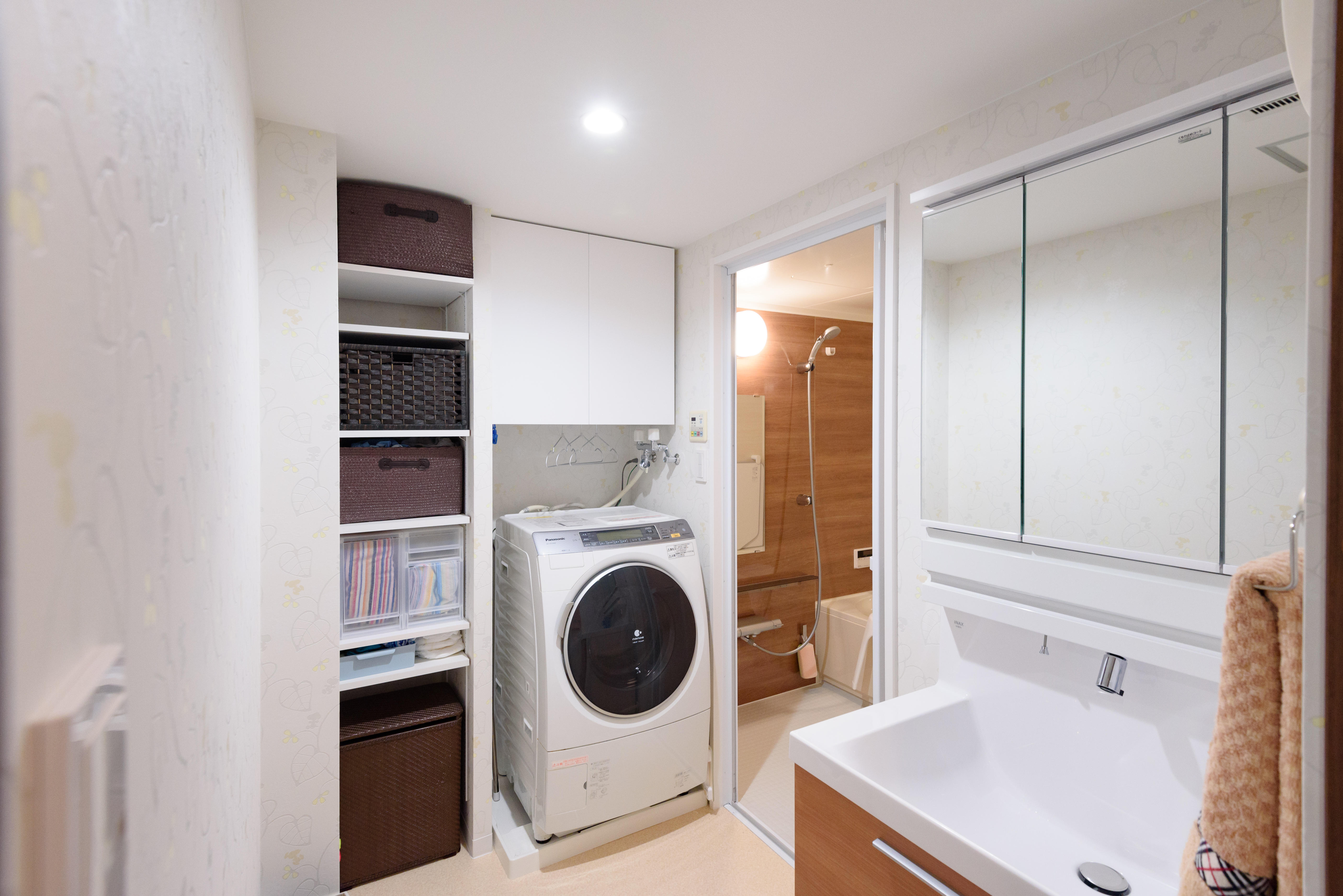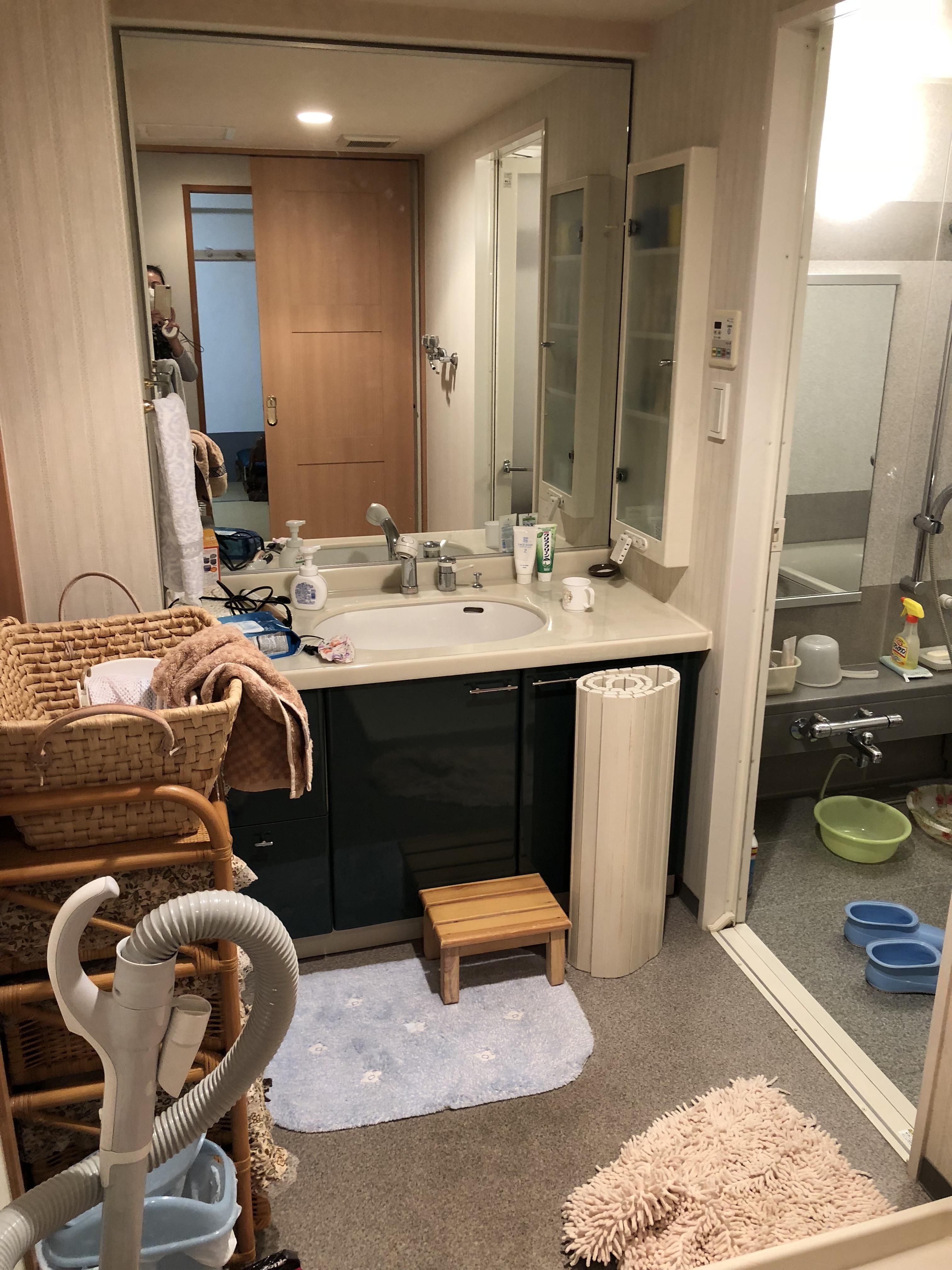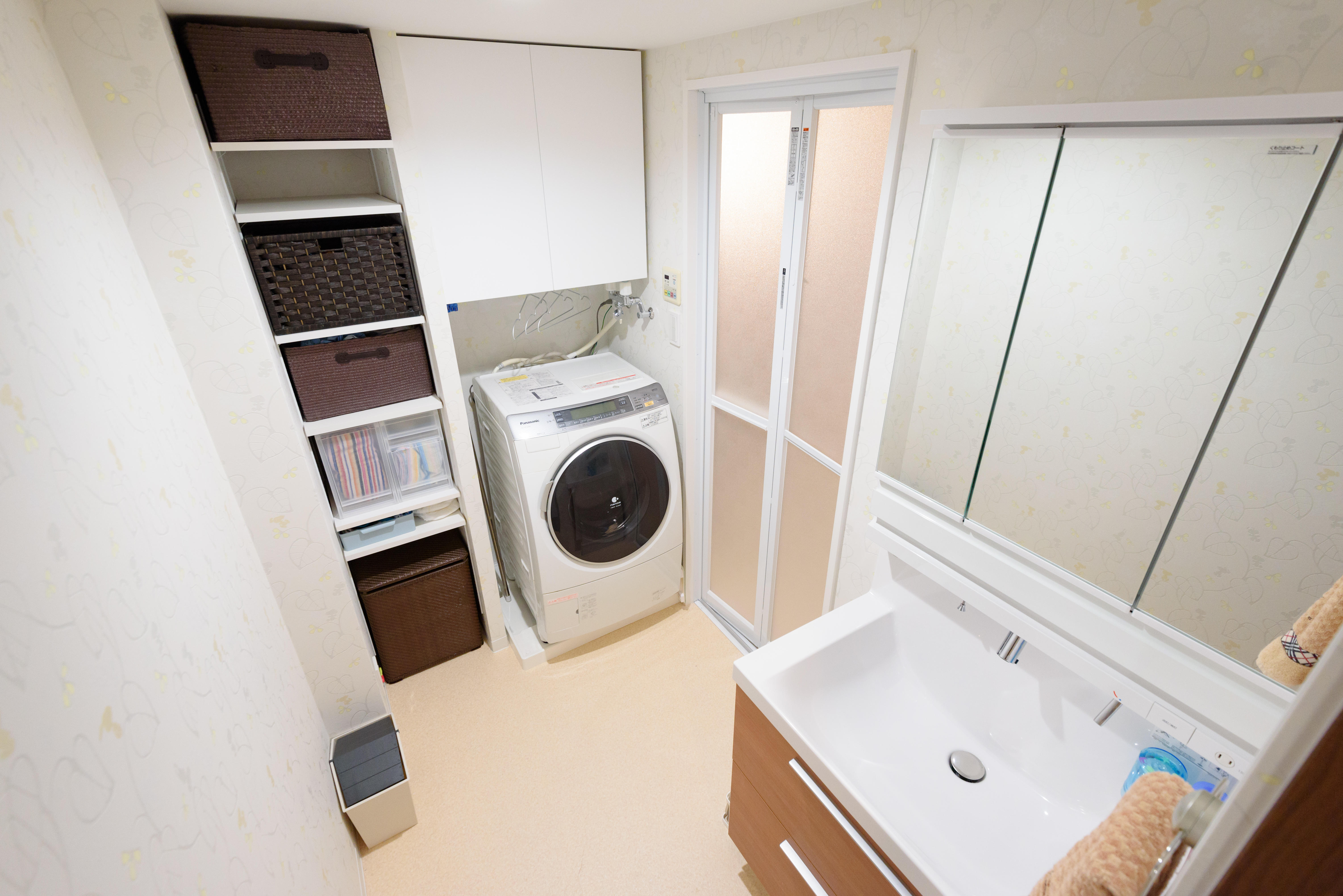 スペースはあるがゴチャゴチャしていた洗面室。洗濯機パンと化粧台を入れ替えて、収納棚とランドリーラックを造作しました