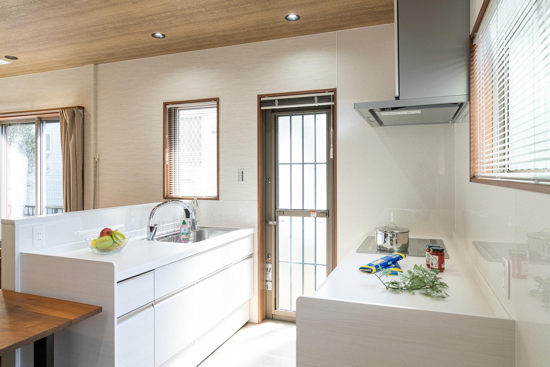 奥様念願の対面キッチンと勝手口。スペースに制約があり、勝手口も耐力壁を避ける必要があった為、キッチンは二列配置をご提案をしました。シンク側W1650コンロ側W1800と十分な大きさの二列型なので、家電を置くことができ、引き出し収納にはお二人分の食器を十分収納できてキッチン周りがすっきりコンパクトになりました。お仕事をされている奥様の為、便利機能満載(食洗機・ハンズフリー水栓・お手入れ楽々レンジフード)の使いやすいキッチンです。明るく使い勝手の良いキッチンで家事効率もアップしました。