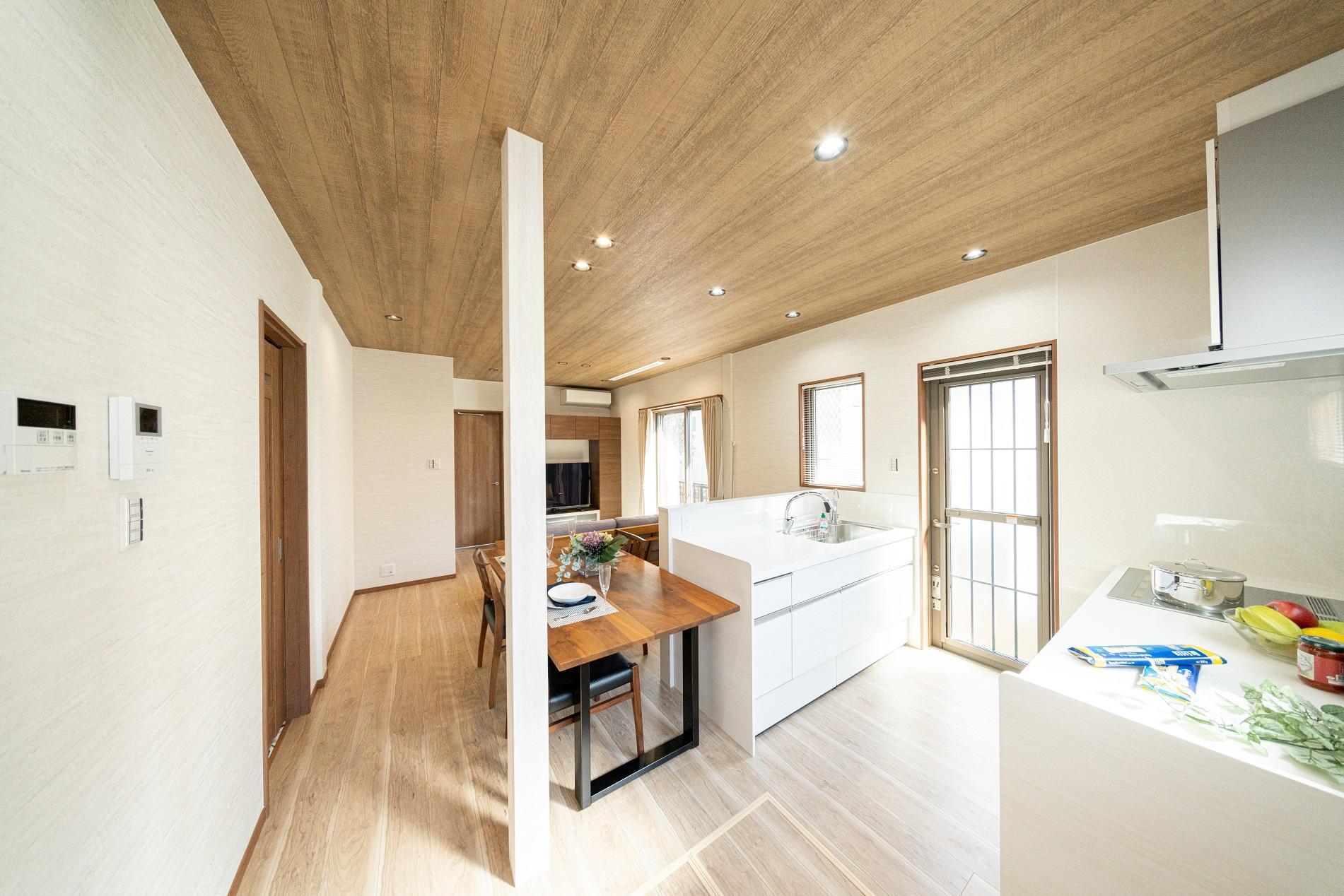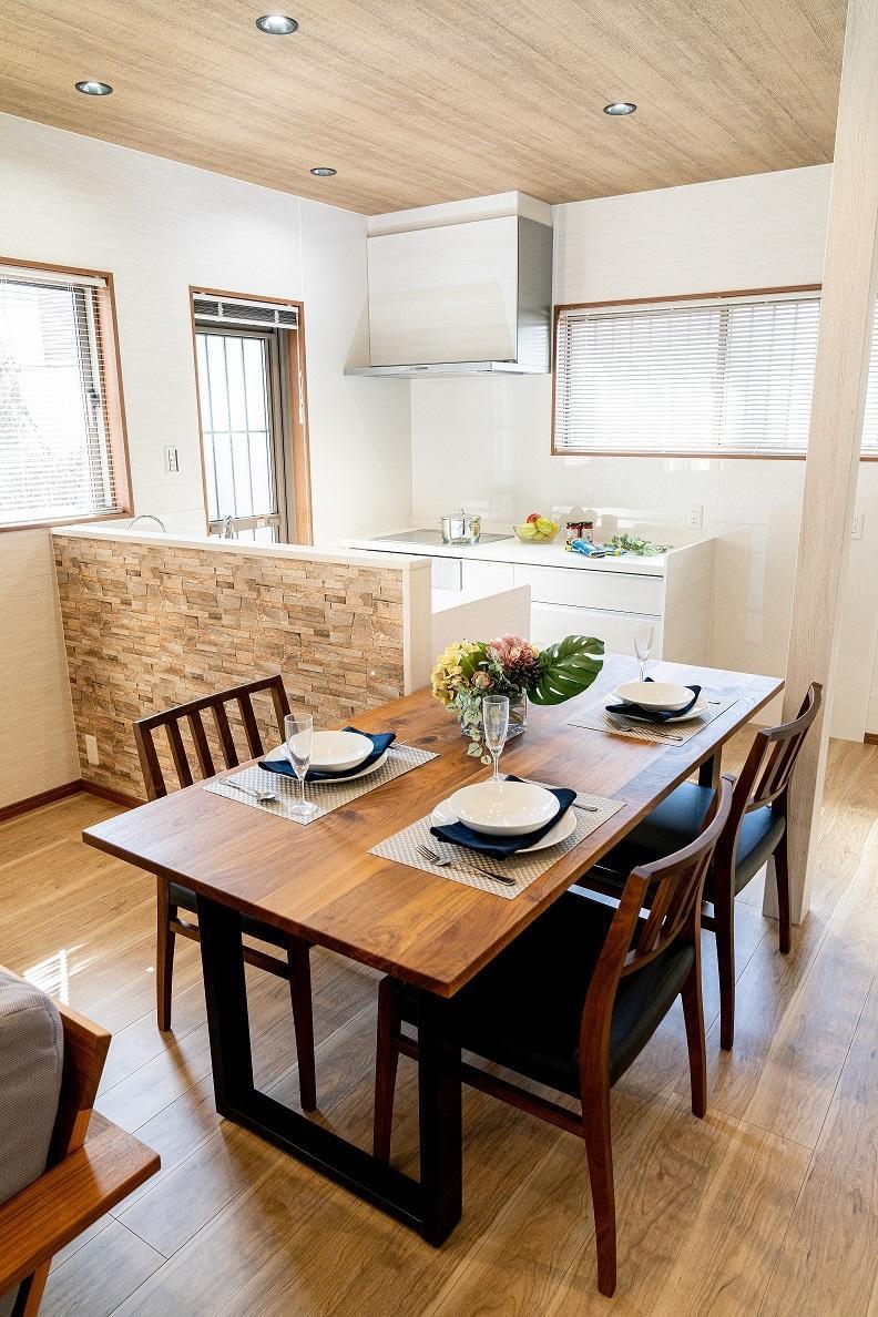 建物を補強するための新しい柱を設置する必要があり、ダイニングキッチンや通路に制約が出た為、プランを工夫してキッチンと新設した補強柱の間にダイニングテーブルが置ける様キッチンの幅を調整して通路もしっかり確保しています。柱は化粧材で巻き込んでオシャレに、配置に工夫したので柱が邪魔に感じません。また、シンクの横並びにテーブルがあるので、配膳や片付けが楽になりました。食卓とキッチンが近くなりお二人の会話も弾むことと思います。