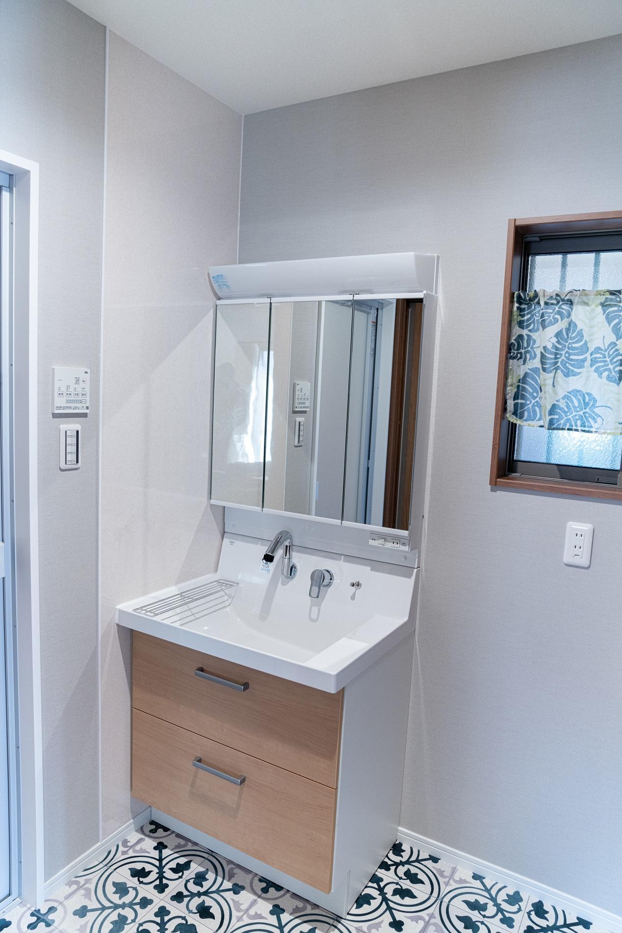 以前より広くなり、廊下とLDKから2Wayの洗面室。回遊動線で便利です。今まで玄関からぐるっと回って干しに行っていていた洗濯物が、キッチンの勝手口からウッドデッキにバリアフリーで出ることができるようになり、とても楽になりました。ダイニング側のドアを開けておけば、洗面室が暖かくヒートショックも安心です。
