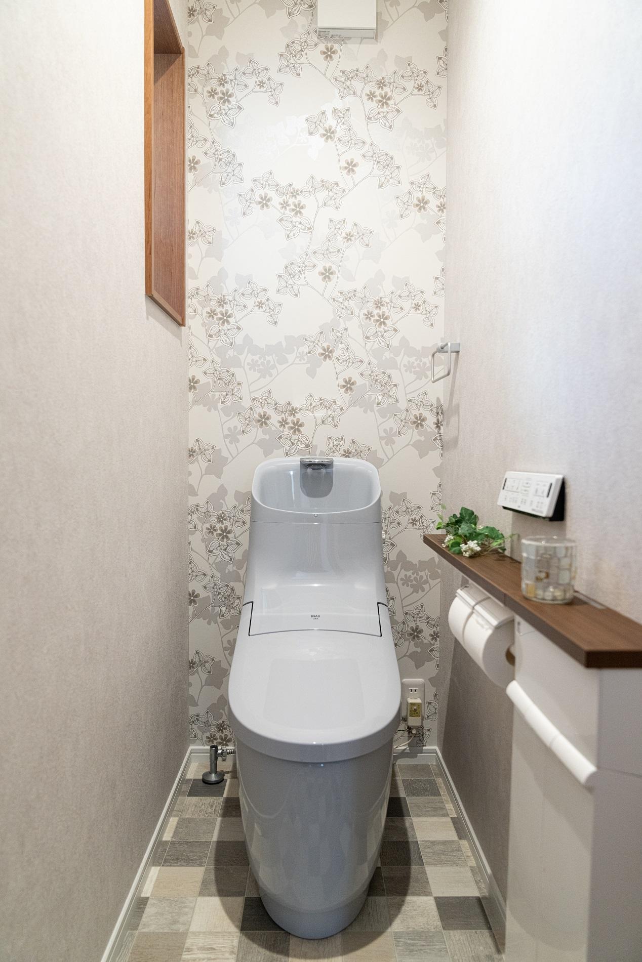 今回のリフォームでご主人様がいちばん快適になることにこだわられたのがトイレでした。階段下の出入り口にあり、段差がきつく狭かったトイレは、玄関横の押入だった場所に移動しました。寝室の横で夜中のトイレも安心です。スペースも以前より大きく取り、手すり代わりになるカウンター付きのペーパーホルダーと収納も設置しました。グレーの便器と落ち着いた北欧調のクロスがマッチして、とても気に入っておられます。