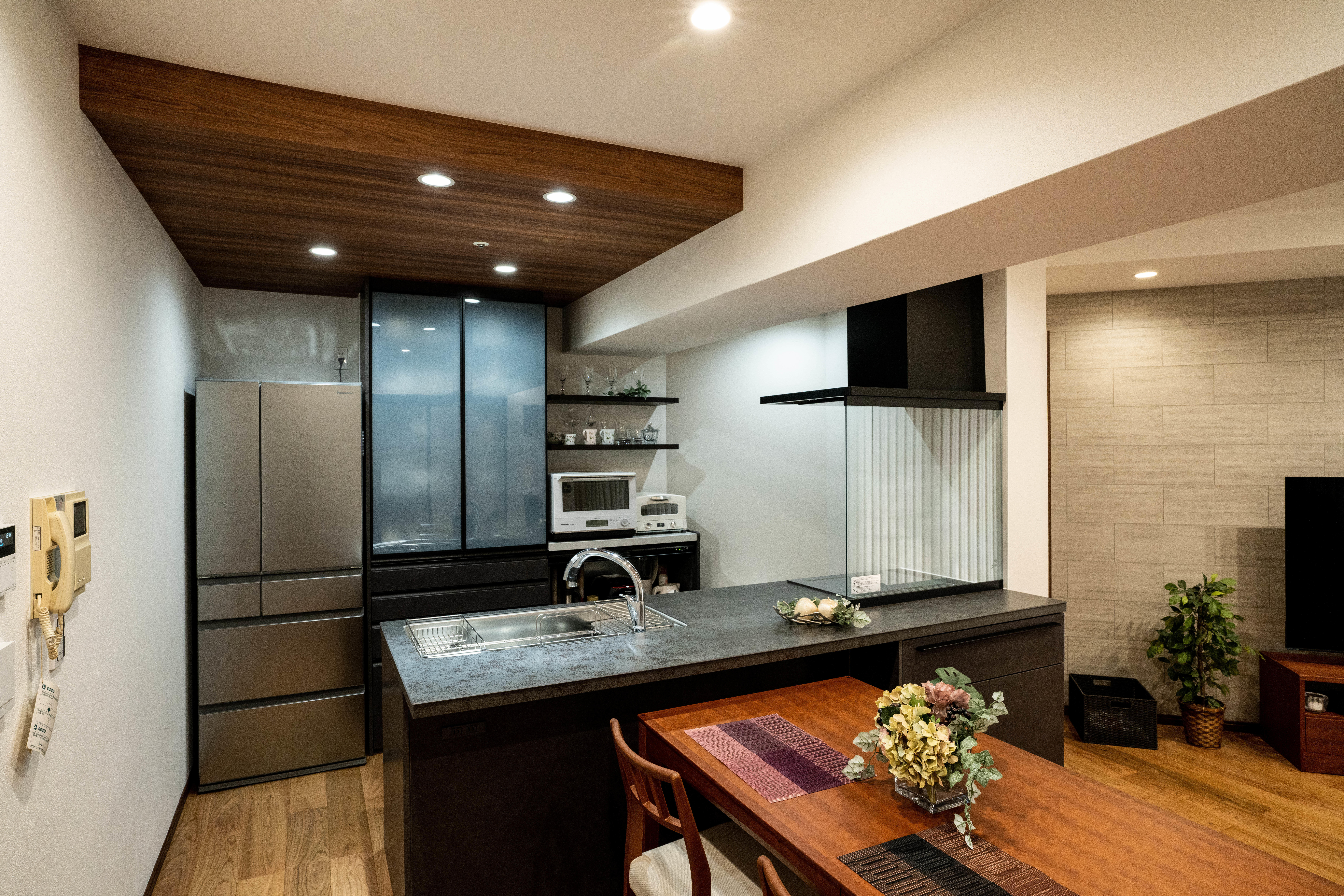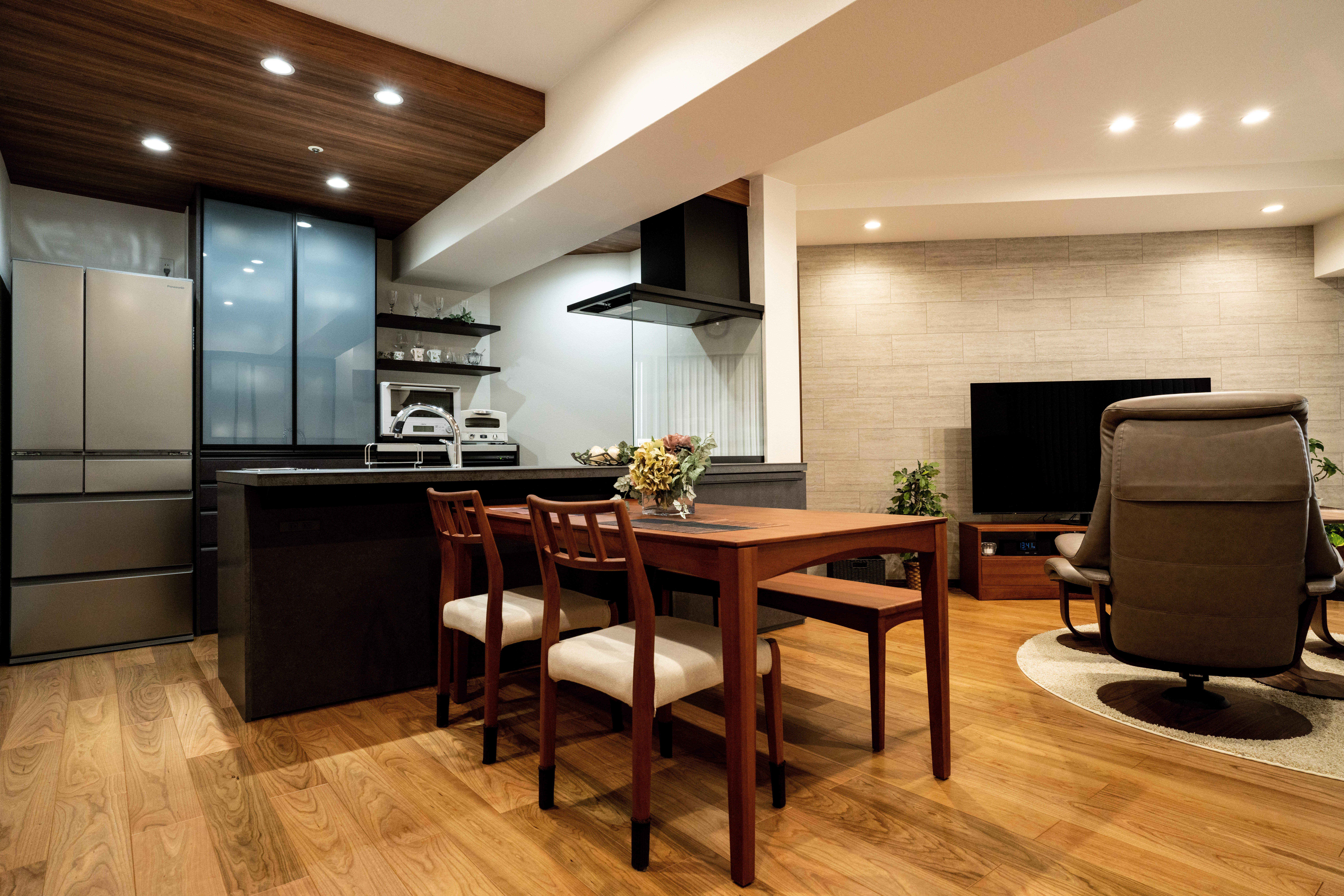 グレーズグレーのインダストリアル風のキッチンは天井を木目にすることで暖かく、より一層大人っぽい雰囲気を生み出します。食卓でホットプレートなどをご使用されるということでしたので、キッチンのバックパネルにはコンセントを設置しています。最後の最後まで悩みぬかれたLIXILのリシェルSIはとってもハイスペック!お仕事でお忙しい奥様にも嬉しいお手入れ楽々で使い勝手抜群の機能が沢山です。