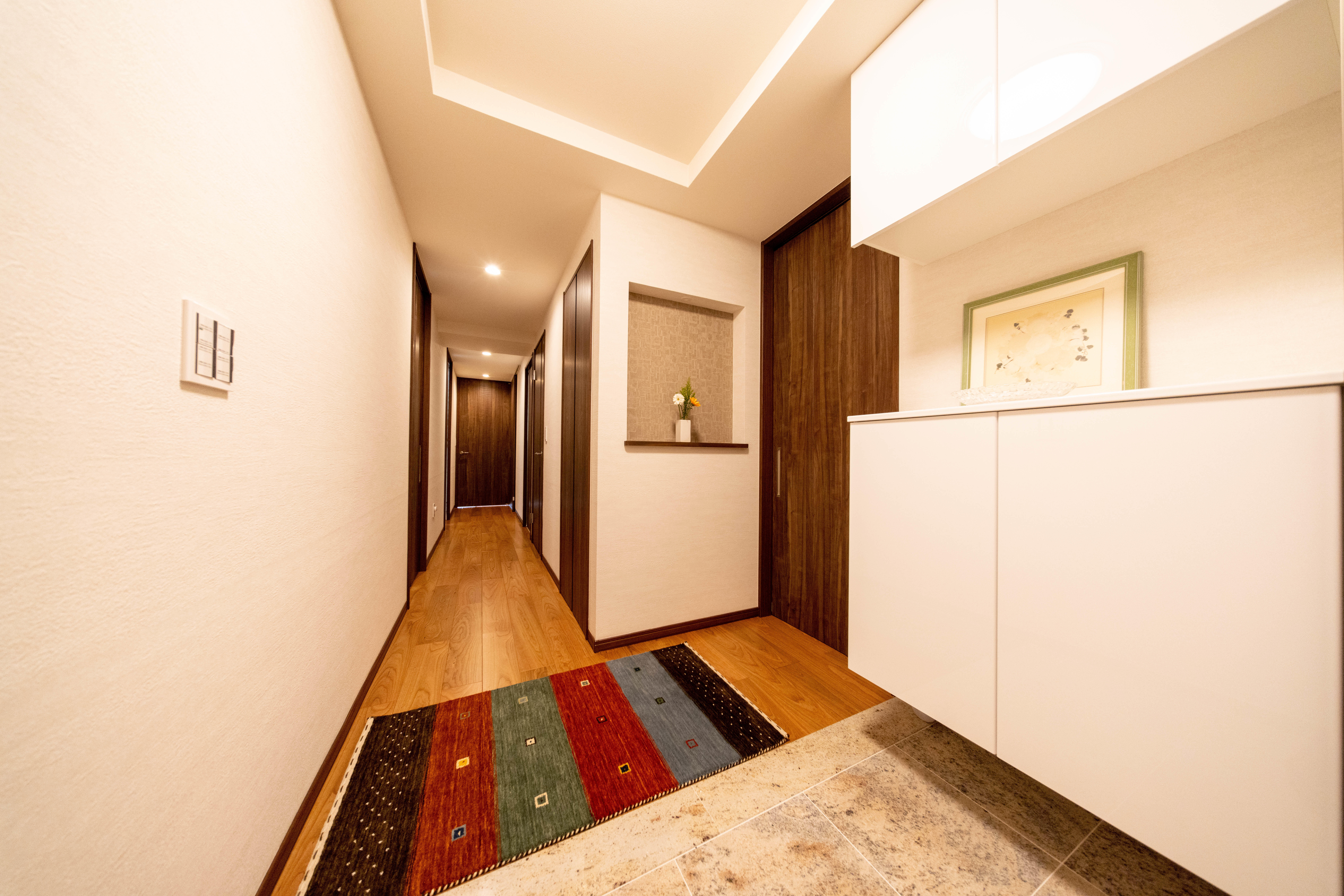 玄関はスペースを広げ三和土を御影石に貼り替えました。バニラホワイトの御影石は優しい雰囲気を作り上げつつも高級感が漂います。玄関収納は鏡面扉にグレードアップ。折上げ天井は広げたスペースに合わせて拡張しニッチも新設しています。廊下には日用品のストック収納に、と奥行の深い物入を設置。突き当りにある寝室ドアは奥様のお気に入りです。