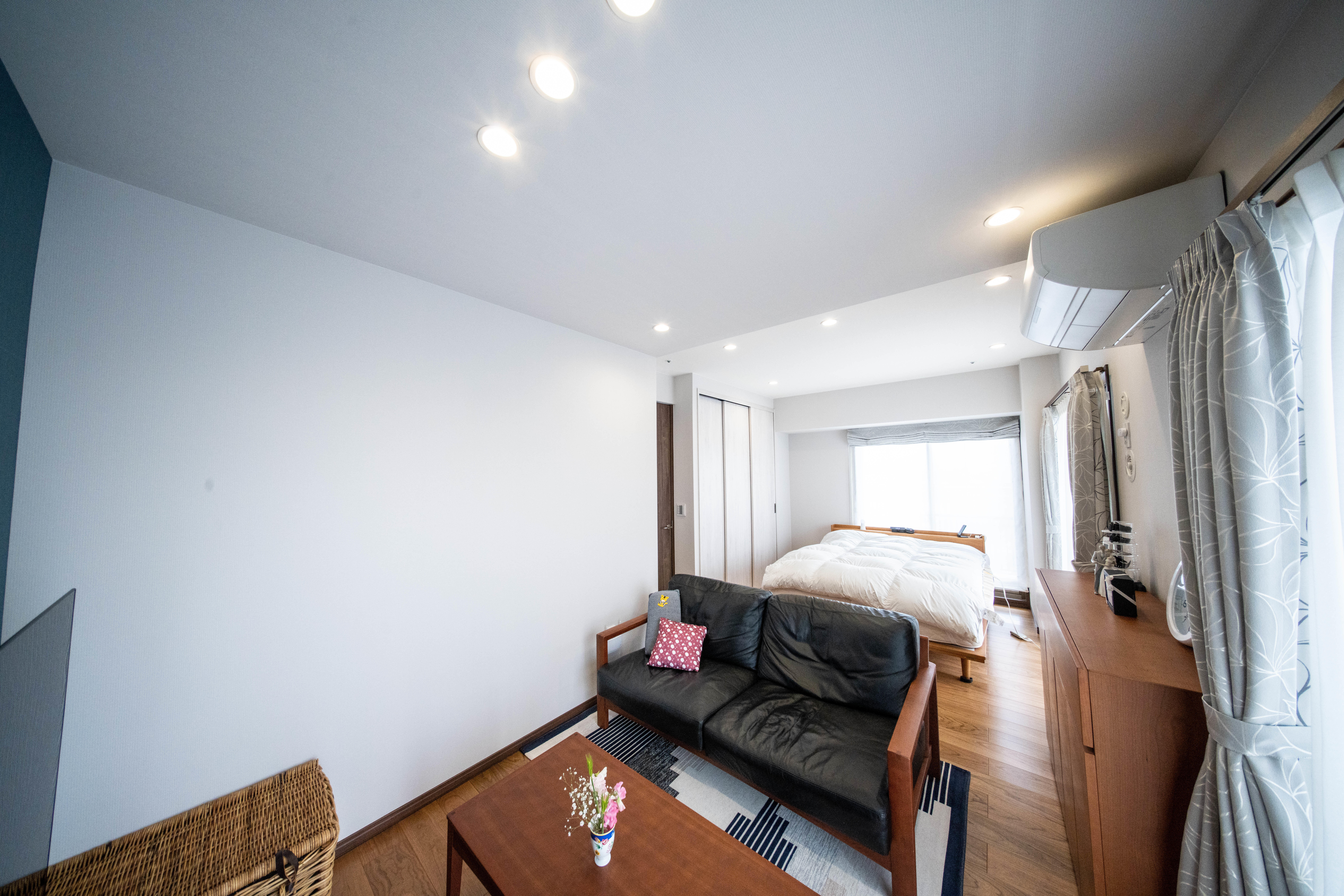2部屋を繋げてとても広くなった寝室兼ご主人のテレビ部屋。奥様のリモート中にも気兼ねなくテレビを楽しむことができます。クローゼットの三枚引戸はホワイトにすることで壁になじみ統一感が生まれました。第二のリビングルームのような贅沢な空間になりました。