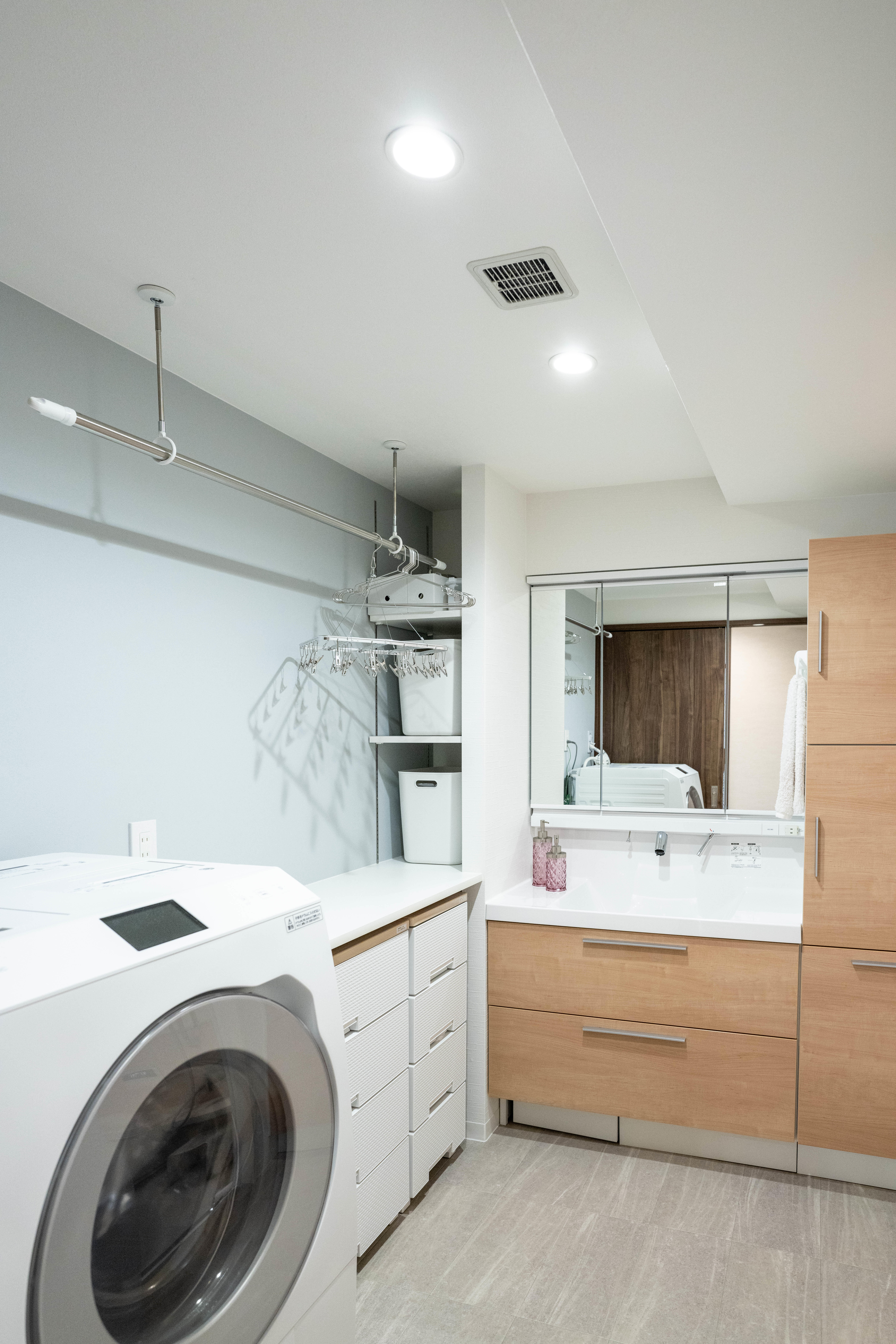 廊下の収納を取り込んで広くなった洗面室。多目的に使えて下部に収納ケースを収められるカウンターを設置、オープン棚と物干しポールを取り付けてシンプルな形になりました。トール収納付きの洗面化粧台はLIXILのL.C.(エルシィ)収納力がアップ!