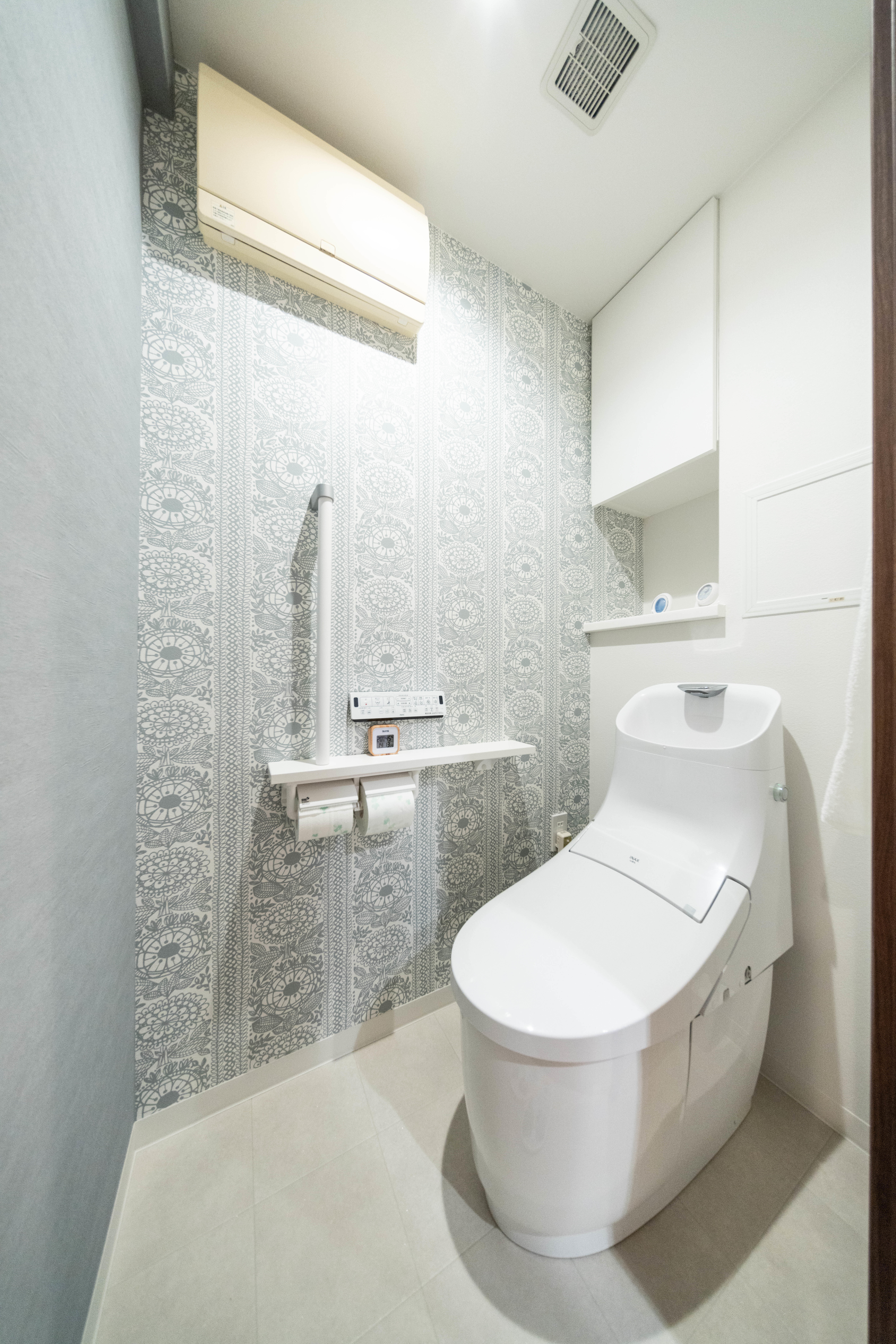 優しい色合いでコーディネートされたレストルーム。奥様が気に入られた北欧柄のクロスがアクセントになりとてもお洒落です。収納棚・カウンターも全て新しいものにお取替え。便器はLIXILのプレアスHSタイプ。照明はオートタイプのダウンライトで優しい光が空間を照らします。