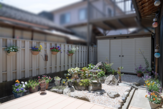 山なりになっていて大きな木が2本、見晴らしの悪かったお庭を整地し、太陽の光をしっかりと取り込めるように。リビングと洋室、お母様のお部屋の計3か所の掃き出し窓から見える自慢のお庭へと生まれ変わりました。