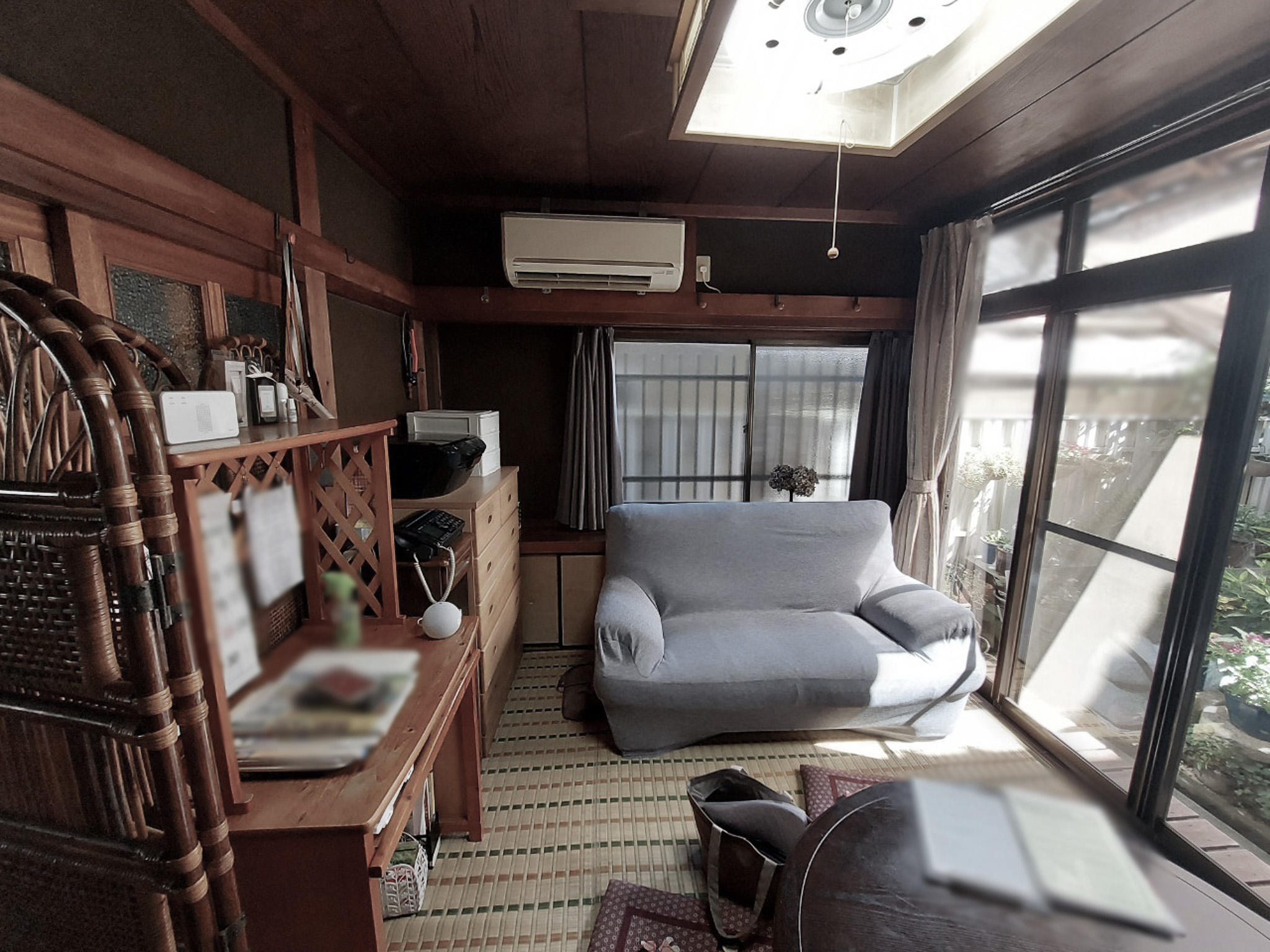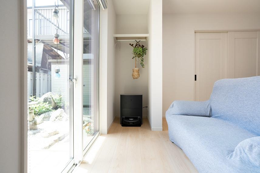 お部屋からも中庭が見えるように…と、7帖の洋室と縁側は、縁側を無くして9帖の1つのお部屋にしました。ソファを置いても広々とした空間です。お掃除ロボットが収納できるスペースを確保。グリーンのお洒落なインテリアはお母さまの手作り!
