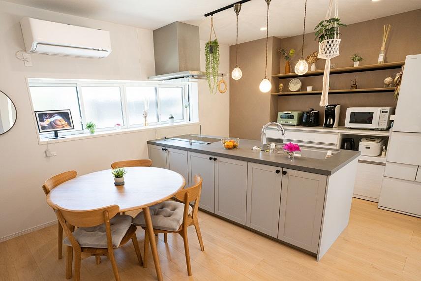 高さが900の壁付けキッチンをペニンシュラ 対面式のキッチンへ。元々のキッチンは少し高くて作業がしづらいとのことでしたので、高さは850mm、取り付けたシステムキッチンはPanasonicのラクシーナです。 カップボードはお施主様がご自身で準備されました。カップボードの上にある2段の飾り棚は弊社施工。見える収納に飾られたお施主様のセンスが光るレイアウトです。