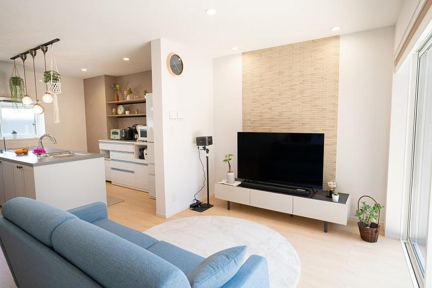 テレビボードの背面にはエコカラットを貼付。アクセントにもなってとってもお洒落です。将来的にテレビを壁掛けできるように壁には下地を打っています。キッチンカップボード背面同様に元々は腰窓がありましたが、内側のみを塞いでいます。ダウンライトは調光可能。テレビ側にある2つは光の向きを調整することも可能です。