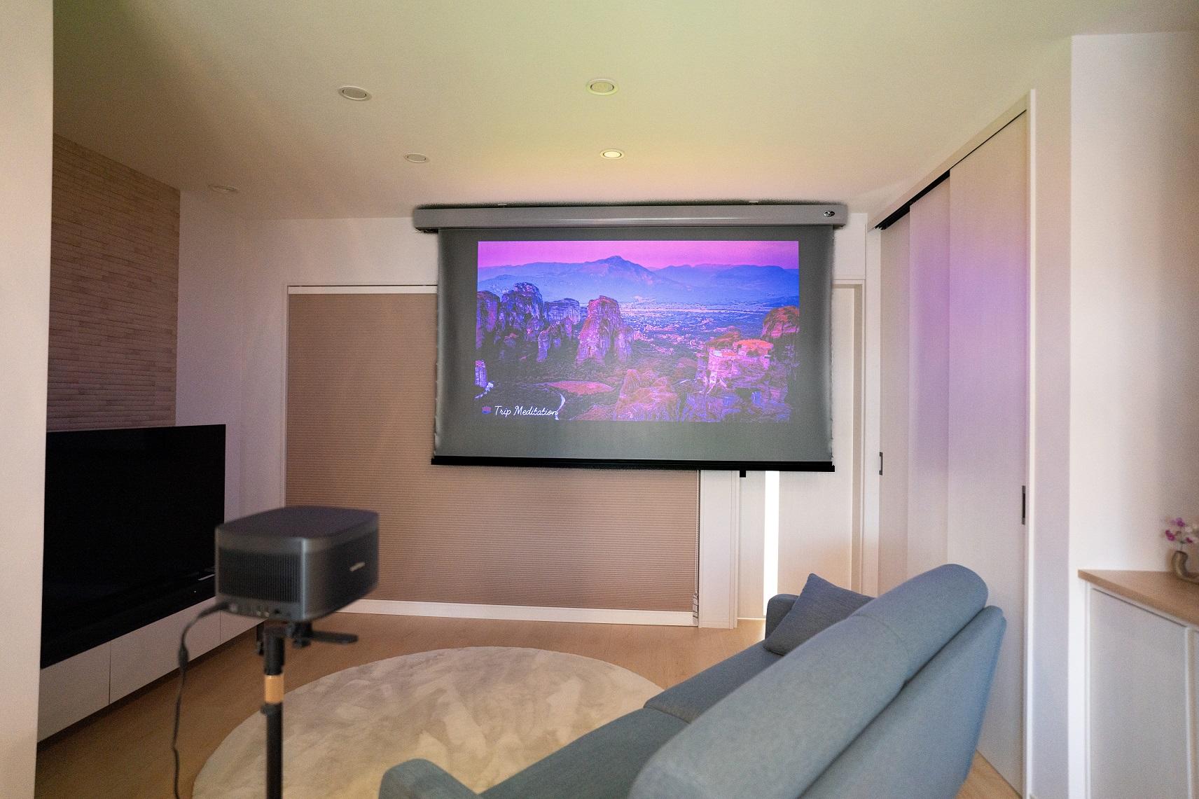 お施主様が前もって購入されていたプロジェクターをお取付。当初はテレビの位置へ取り付ける予定でしたが、プロジェクターとスクリーンとの位置が近すぎてしまうので、掃き出し窓の前にスクリーンを設置しました。映し出された瞬間、スタッフもカメラマンさんもあまりの迫力に大興奮。
