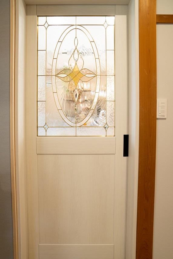 玄関からすぐにあるリビングへと続く引き戸にはお母様が一目ぼれされたステンドグラスが。光でキラキラ輝いてとても魅力的です。