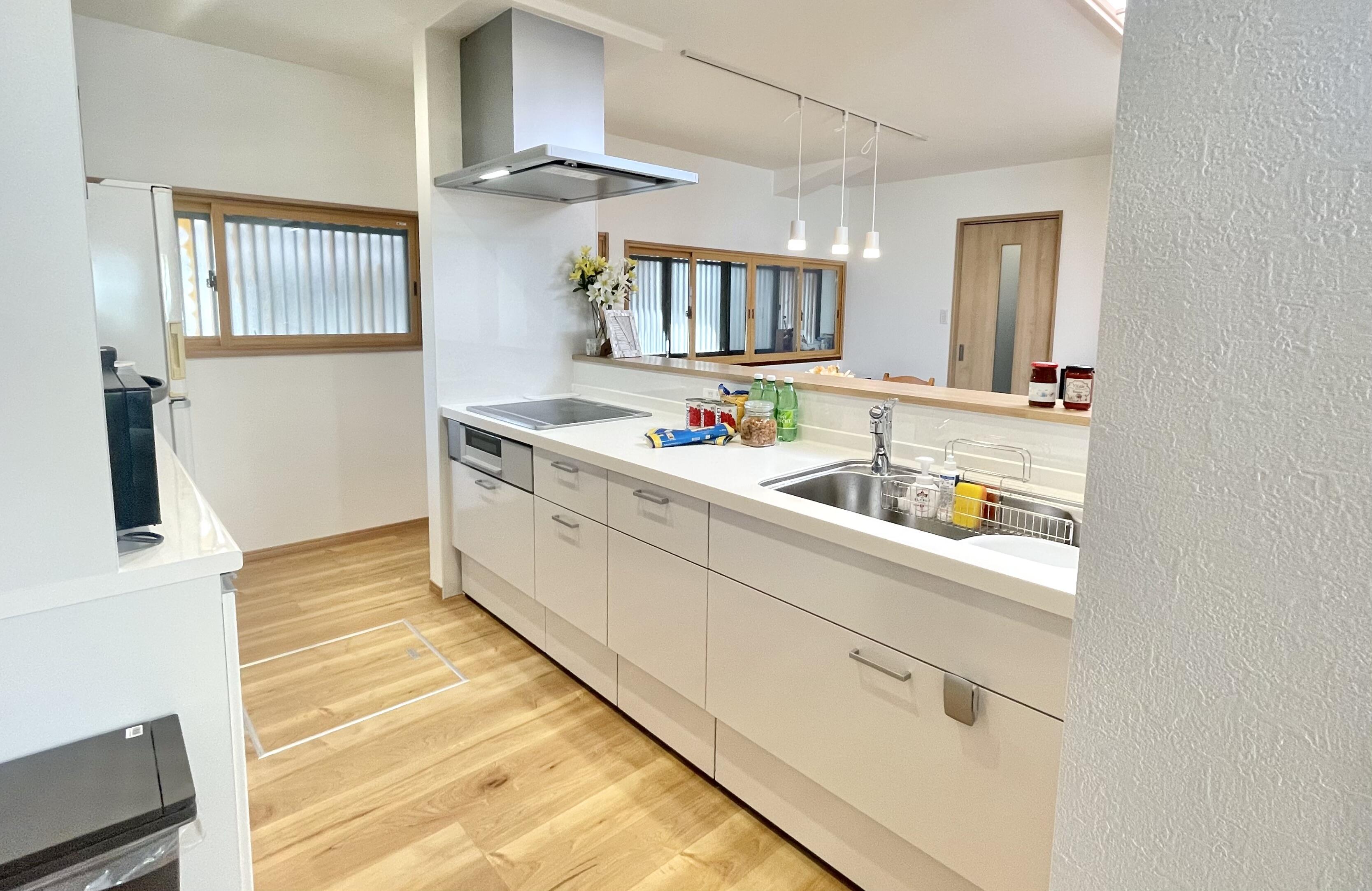 元々のキッチンはL型でシンク側が対面になっていました。作業スペースが狭く、収納も足りず…この間取りのままで対面キッチンにするには通路が狭くなってしまいますので、キッチンを少し前に出すことで余裕のある空間になりました。例えばキッチンでの作業時も誰かが冷蔵庫に飲み物を取りに来ても邪魔にならないような場所に設置することができました。壁を開けてリビングから回遊できるようになり、動線もばっちり!キッチン:LIXILシエラ