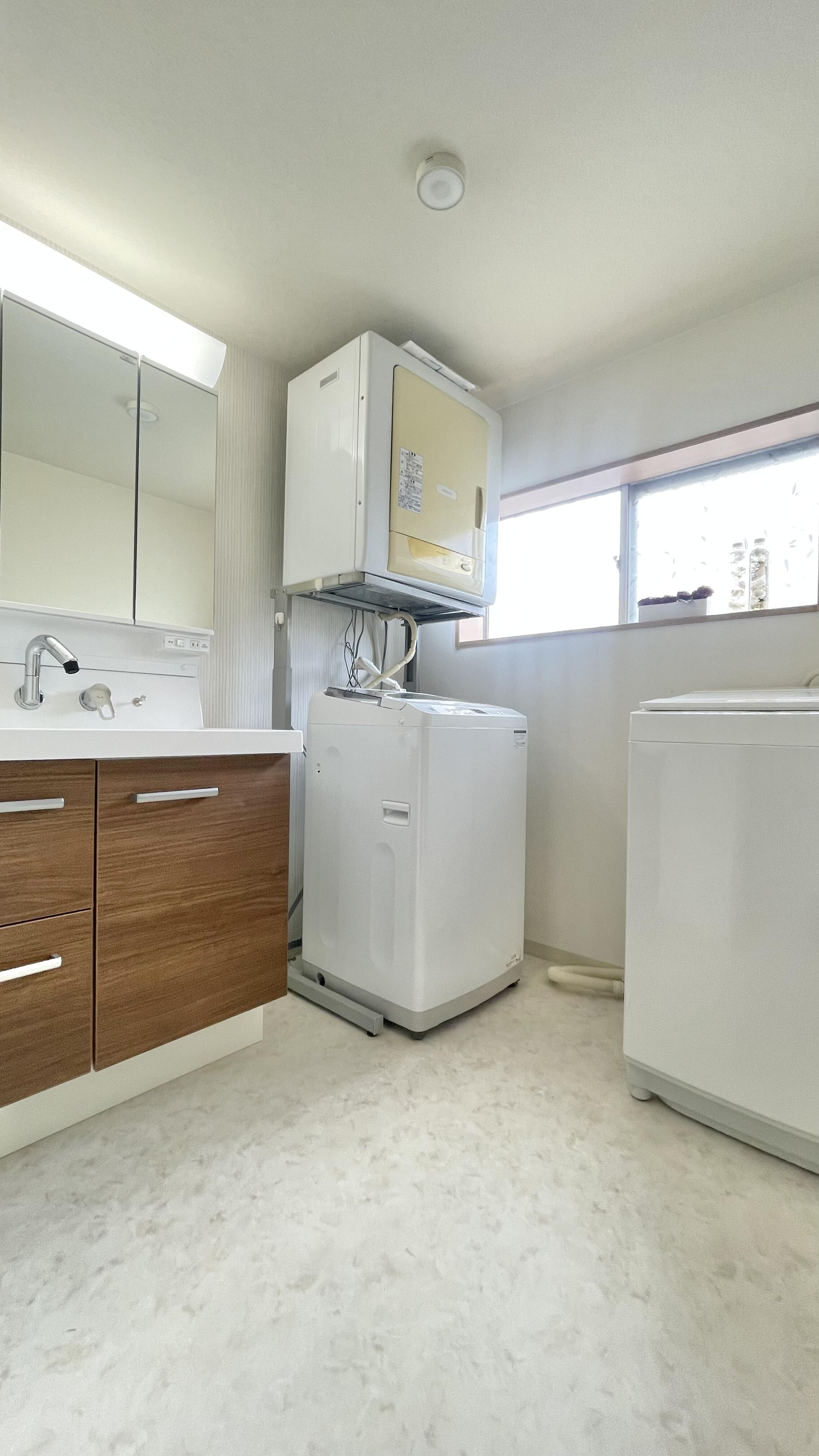 洗面、浴室は元々増築されたスペースにありました。当初は壊して移動する計画もありましたが、その分金額も掛かりますのでそのままの場所を活用することに。洗濯機を2台置いてもゆったり!