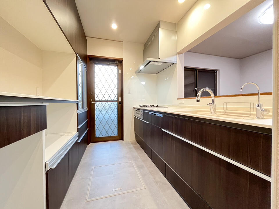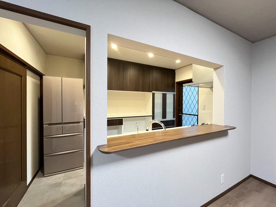 これまでキッチン前の開口部が狭く、リビングとのつながりが感じにくい間取りでしたが、開口を広げることで視界が大きく開け、開放感のあるキッチンへと生まれ変わりました。
