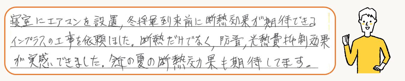 寝室にエアコンを設置、冬将軍到来前に断熱効果が期待できるインプラスの工事を依頼しました。断熱だけでなく、防音、光熱費抑制効果が実感できました。今年の夏の断熱効果も期待してます。
