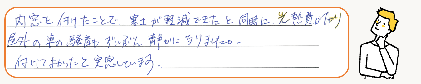 内窓を付けたことで寒さが軽減できたと同時に光熱費が下がり屋外の車の騒音もずいぶん静かになりました。付けてよかったと実感しています。