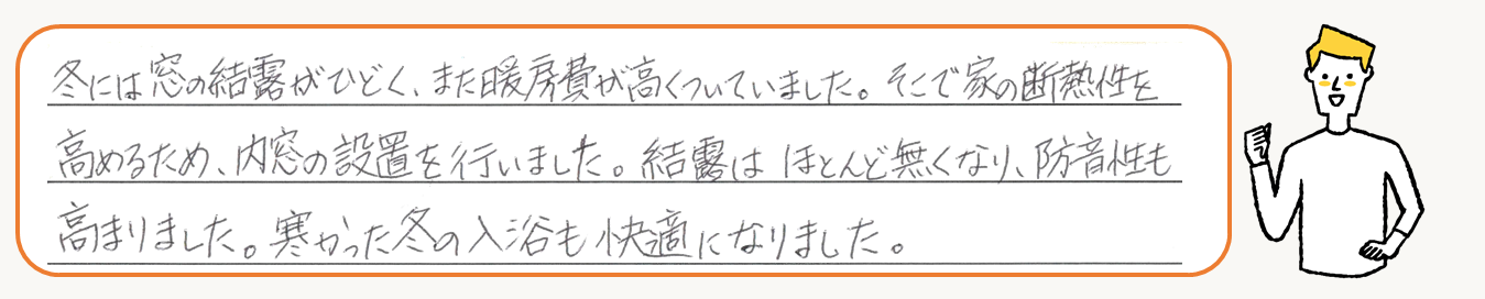 冬には窓の結露がひどく、また暖房費が高くついていました。そこで窓の断熱性を高める為、内窓の設置を行いました。結露はほとんど無くなり、防音性も高まりました。寒かった入浴も快適になりました。