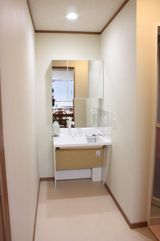 奥様の足が悪かった為、将来的に車椅子でも使用できる水廻りにして欲しいとのご要望で、システムキッチン、洗面化粧台は車椅子のままでも使用できる設備機器をご提案。オール電化住宅に変更し、安全面でも配慮しました。