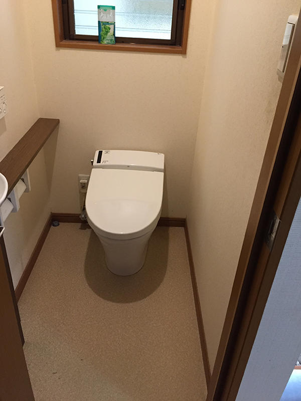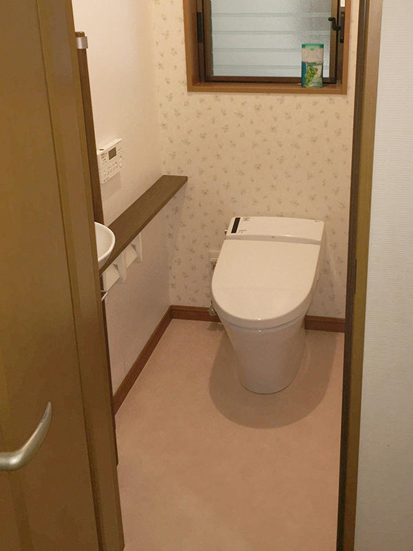 トイレの臭いが気になるので内装を貼り替えたいとのご希望でしたので、壁紙と床の張替をさせていただきました。汚れの目立たない色・柄を選んでいただきました。
