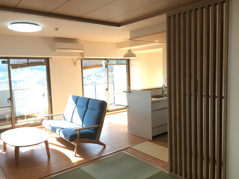 キッチンが暗い、狭い、使いにくいとのことでしたので、キッチンの間仕切りを取り、開放的にし、広く使えるようにしました。また、和室が暗いということでしたので、LDKと和室の間仕切りを取ることで部屋が明るくなりました。 琉球畳や格子をとりつけることで、明るく開放的な和室になりました。