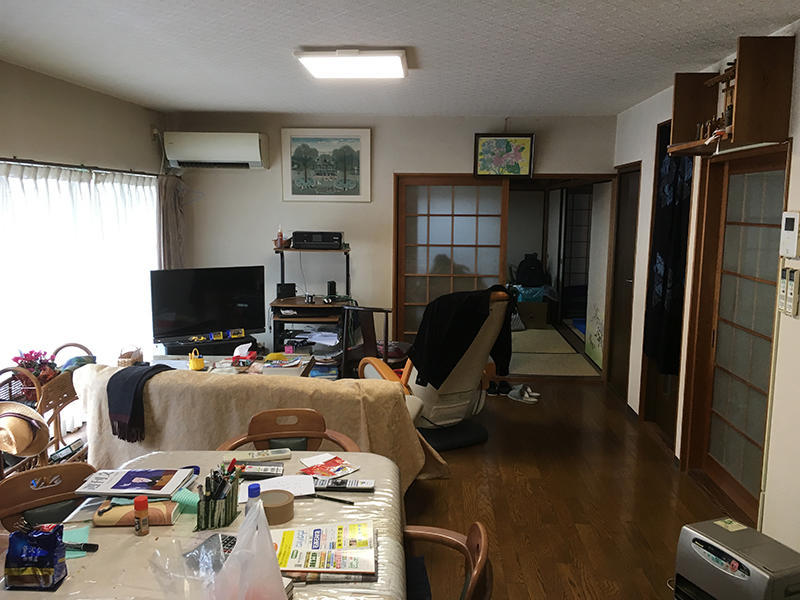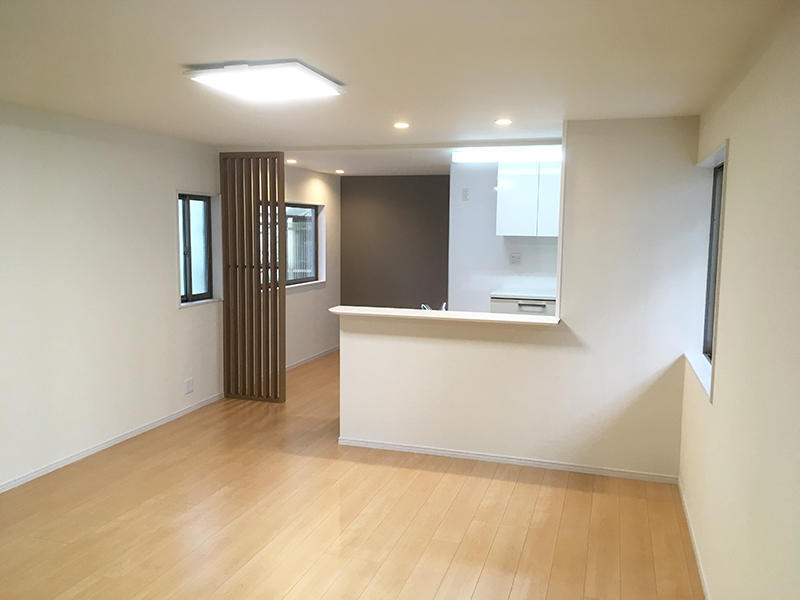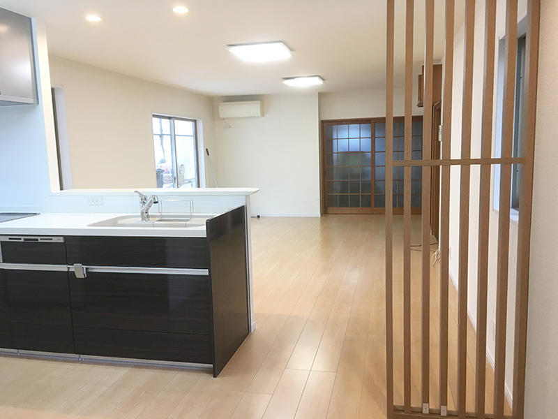 対面式のキッチンにすることで、明るく開放的になり、収納も背面に設け、取り出しやすく、使いやすくしました。 LDKと洗面所、納戸の間仕切りを取り開放的にしました。パソコンカウンターの間仕切りには格子を採用し、圧迫感なく適度に光を通してくれます。寒さでお悩みでしたが、床暖により寒い季節でも快適に過ごせるようになりました。
