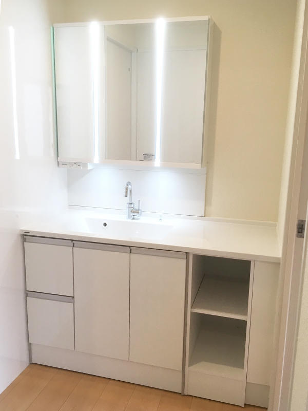 プラン上奥行きが制限されていたので、奥行きが530mmでありながら機能が充実しており、価格もお求めやすいパナソニック製のシーラインを採用しました。 「ツインラインLED照明」はタテ型の照明が鏡の両側から全体を照らしてくれるので、鏡も手元もはっきりと見える明るい空間になりました。