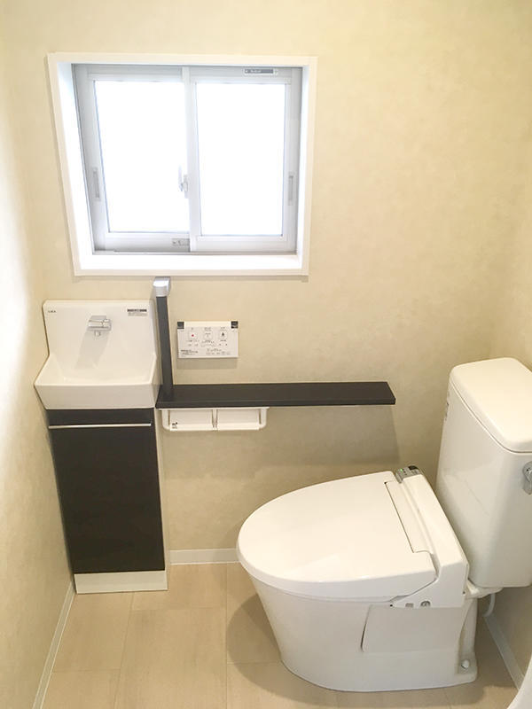 1階しかなく、今風ではないトイレをリフォームしたいとのご希望でした。2階にもトイレを増設し、1階トイレのおしゃれな手洗いキャビネットは、たっぷり収納できます。 またサイドのカウンターは、手のひらやひじで立ちすわりのバランスを支えることができるので、身体にも優しい空間になりました。
