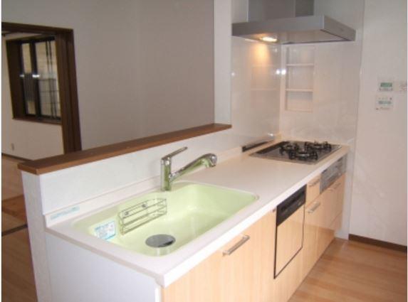 以前はL型のキッチンでした。冷蔵庫や食器棚が遠く使い勝手が良くありませんでした。そこで対面型のキッチンを南側から北側に設置しました。移動により、キッチンの後ろ側に冷蔵庫や家電収納を配置できましたので、お料理がしやすい動線になりました。食洗機付で機能も充実しています。