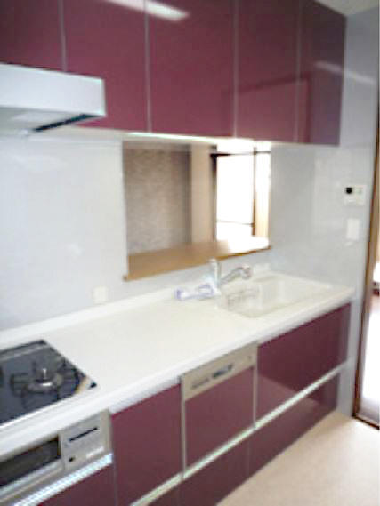 システムキッチンは、ガラストップコンロ、食器洗い乾燥機と機能充実。前面の壁が一部開いたことで、明るくなり、リビングにいる家族との会話もできるようになりました。