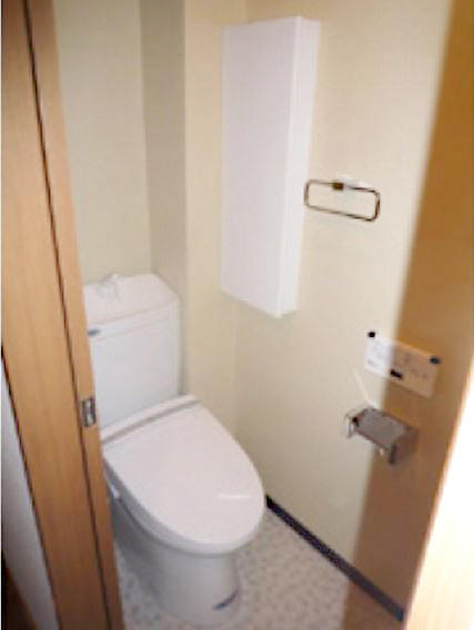 シャワートイレのリモコンが横にないので、すっきりしたデザイン。新しく収納を設置しましたので、小物類もすっきり片付きます。
