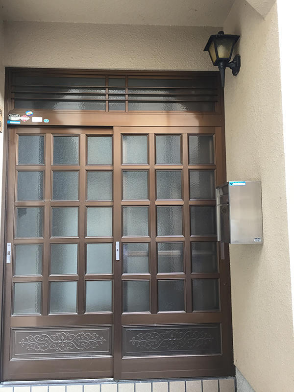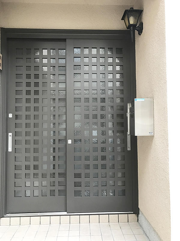 格子の間隔が広く、屋内の明りを付けた時に影が映ってしまうのため、採光は確保しつつ玄関引き戸のデザインを変更したいとのご依頼でした。 出来るだけ格子を細かくして、影の映りが少なくなるような、デザインを選定しました。