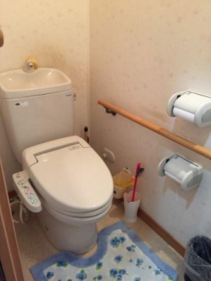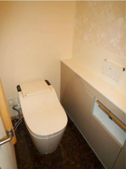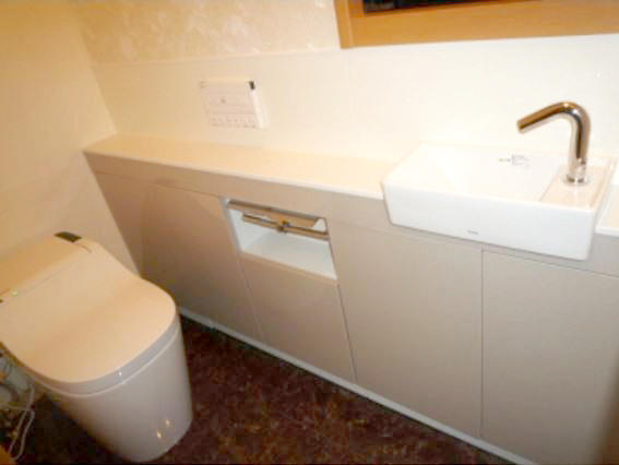 節水便器にしたい 自動洗浄機能のついた便器にしたいとのご要望でしたので、お客様がそれぞれ気に入られた「パナソニックの便器アラウーノ」と「TOTOの手洗カウンター」の別メーカーのものを組み合わせてご提案させていただきました。