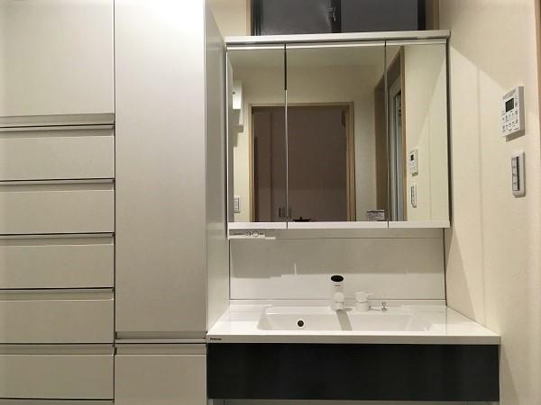 収納キャビネット一体型の洗面化粧台をご選択。圧迫感がなく、さらに収納力がアップしました。「洗面化粧台:Panasonic シーライン」