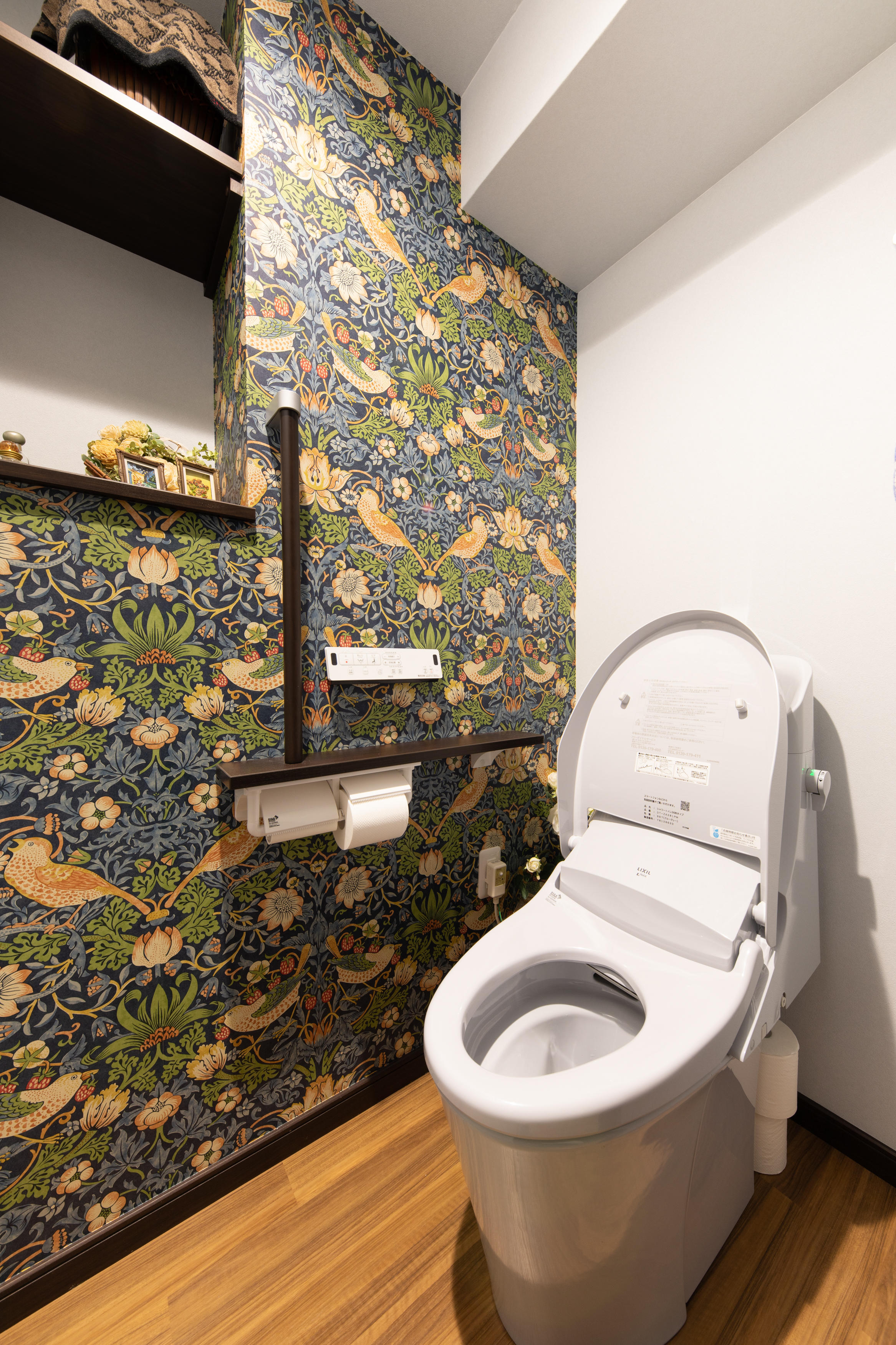 一体型のトイレは手入れ簡単です。アクセントは輸入クロス(ウィリアム・モリスのいちご泥棒)で華やかな空間になりました。「LIXIL アメージュ」