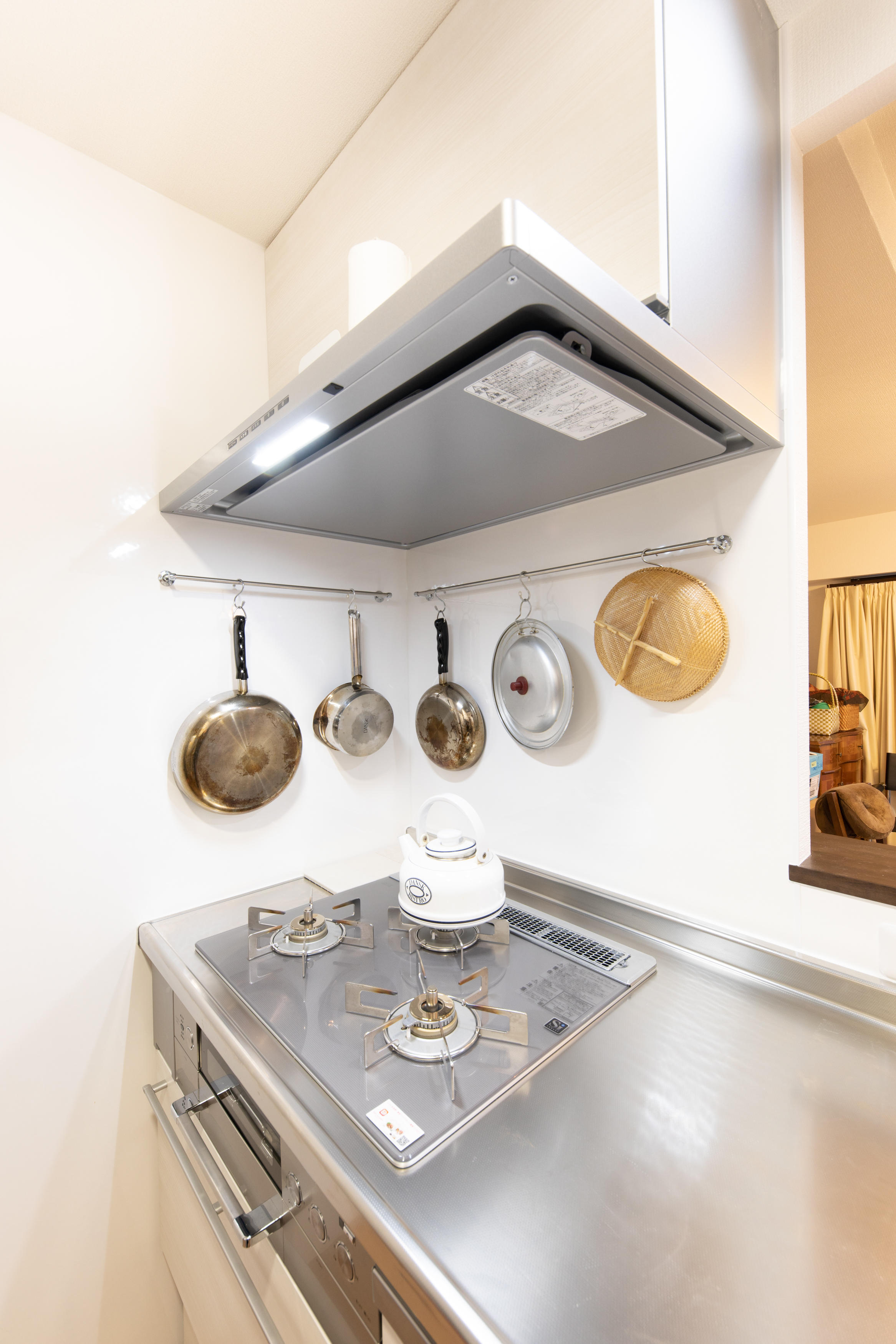 お料理好きな奥様でしたので、料理の幅が広がるココットプレート付きのマルチグリルを採用いただき、壁面にパイプハンガーを取り付けて、見せる収納で使いやすくなりました。「LIXIL アレスタ I型2200 食洗機 マルチグリル(ココット)」