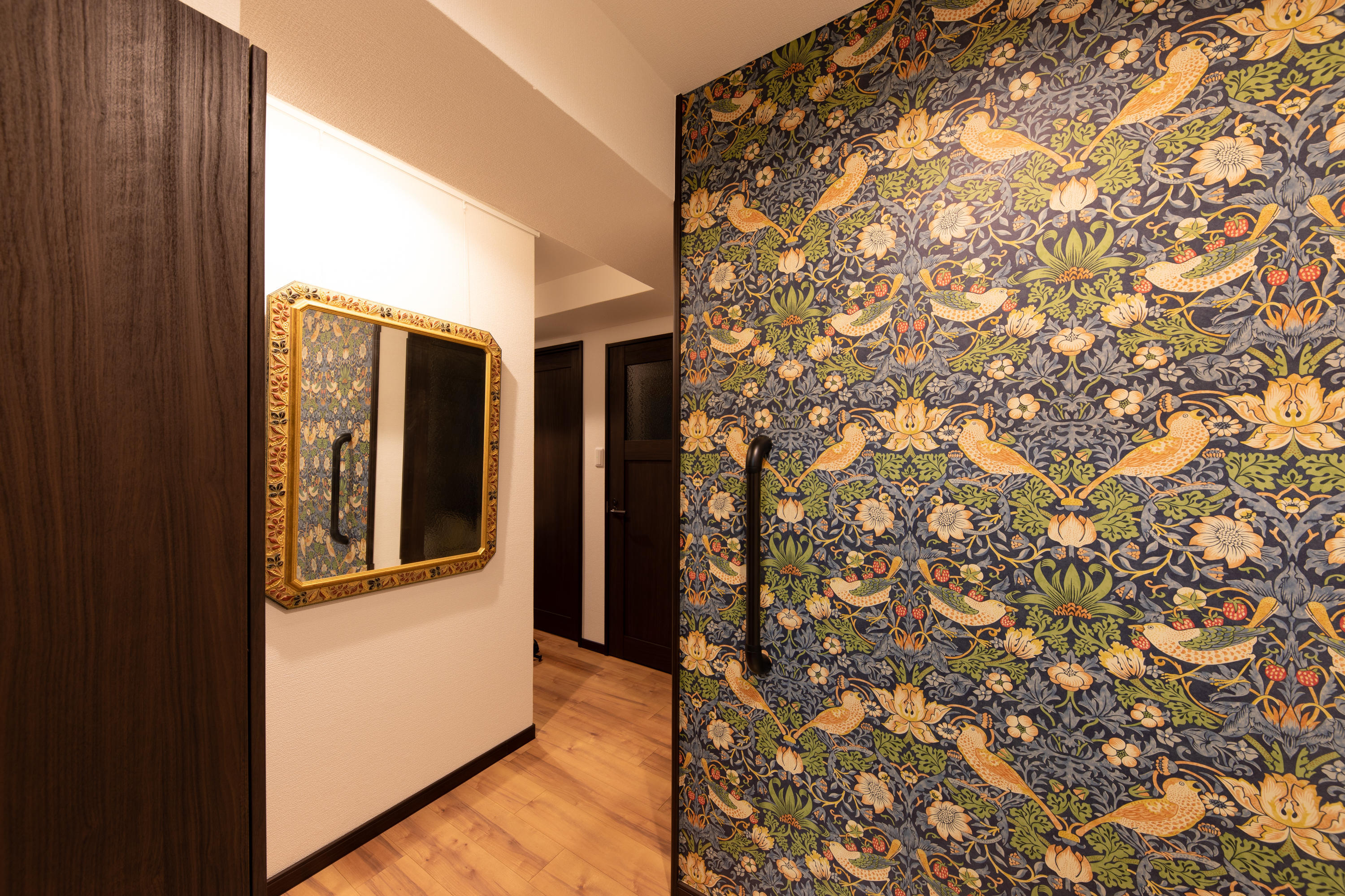 玄関収納の配置やアクセントクロスの位置の打ち合わせを重ねて納得のいく配置に。お気に入りのウィリアム・モリスのいちご泥棒の輸入クロスがアクセントになっています。「STRAWBERRY THIEF DARW / LIXIL ラシッサS玄関収納(クリエダーク) / LIXIL ラシッサDフロア(ライトメープル)」
