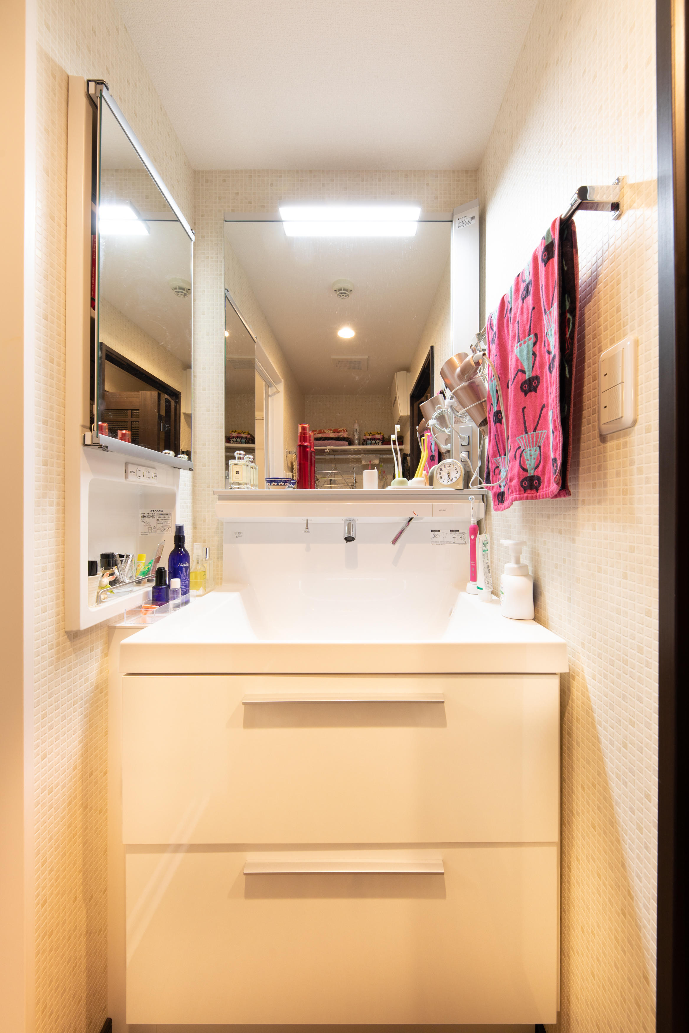 本体の鏡は一面鏡にしてすっきりした洗面台に。小物収納は埋め込み収納を取り付けました。鏡は手前に出てきますので、お化粧も楽チンです。「LIXIL エルシィ / TOTO スウィング埋め込み収納棚」